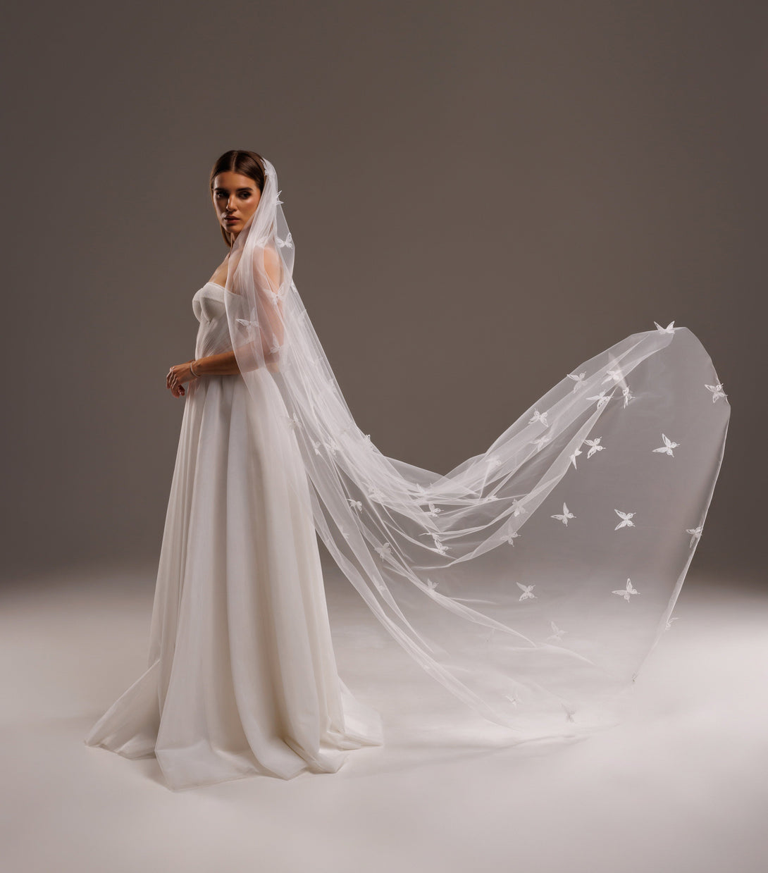 3D butterfly wedding veil. Any length you can exchange or return. We are glad to help you with any questions about your look, dress, size chart etc
