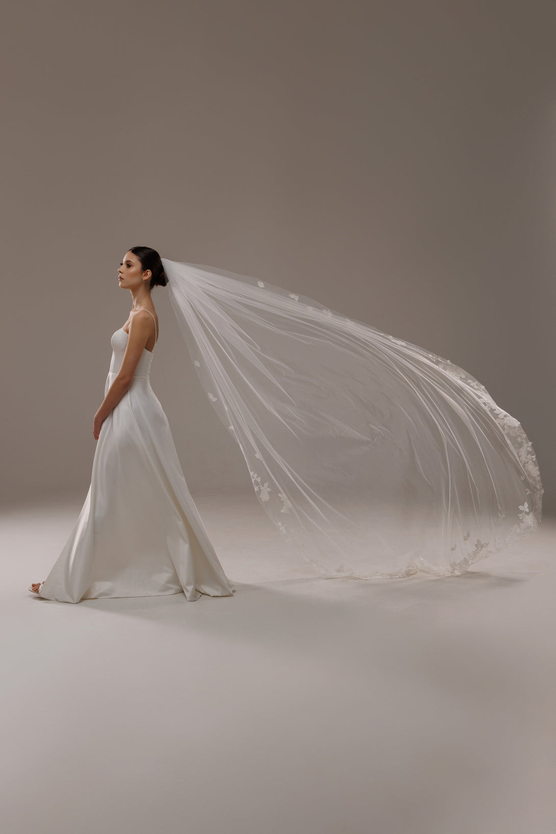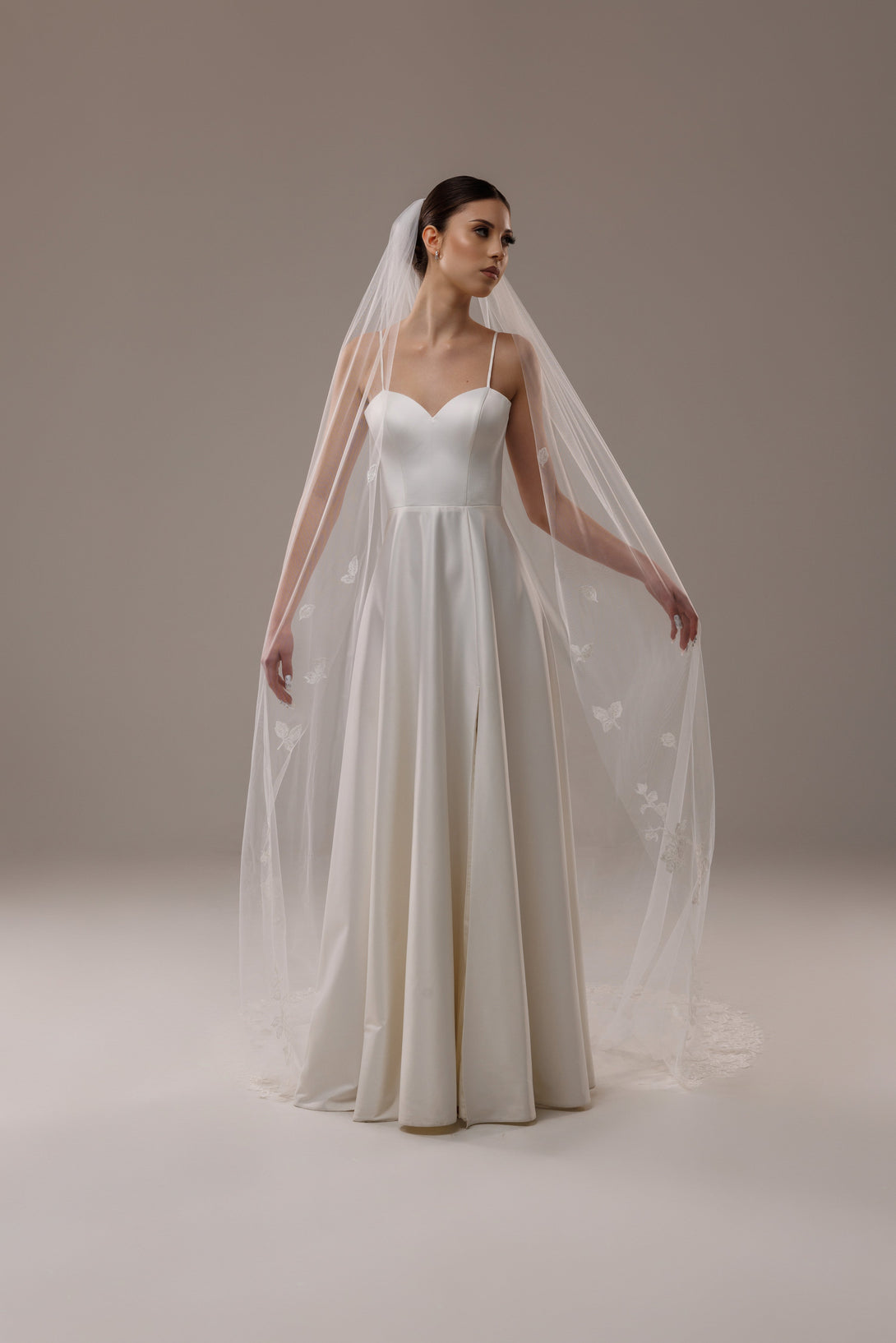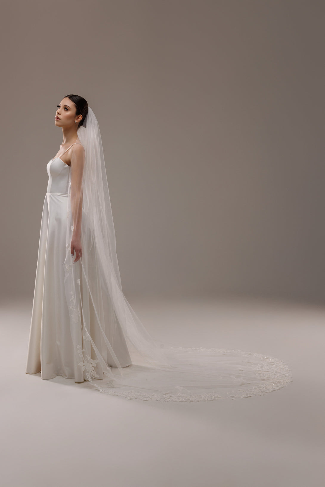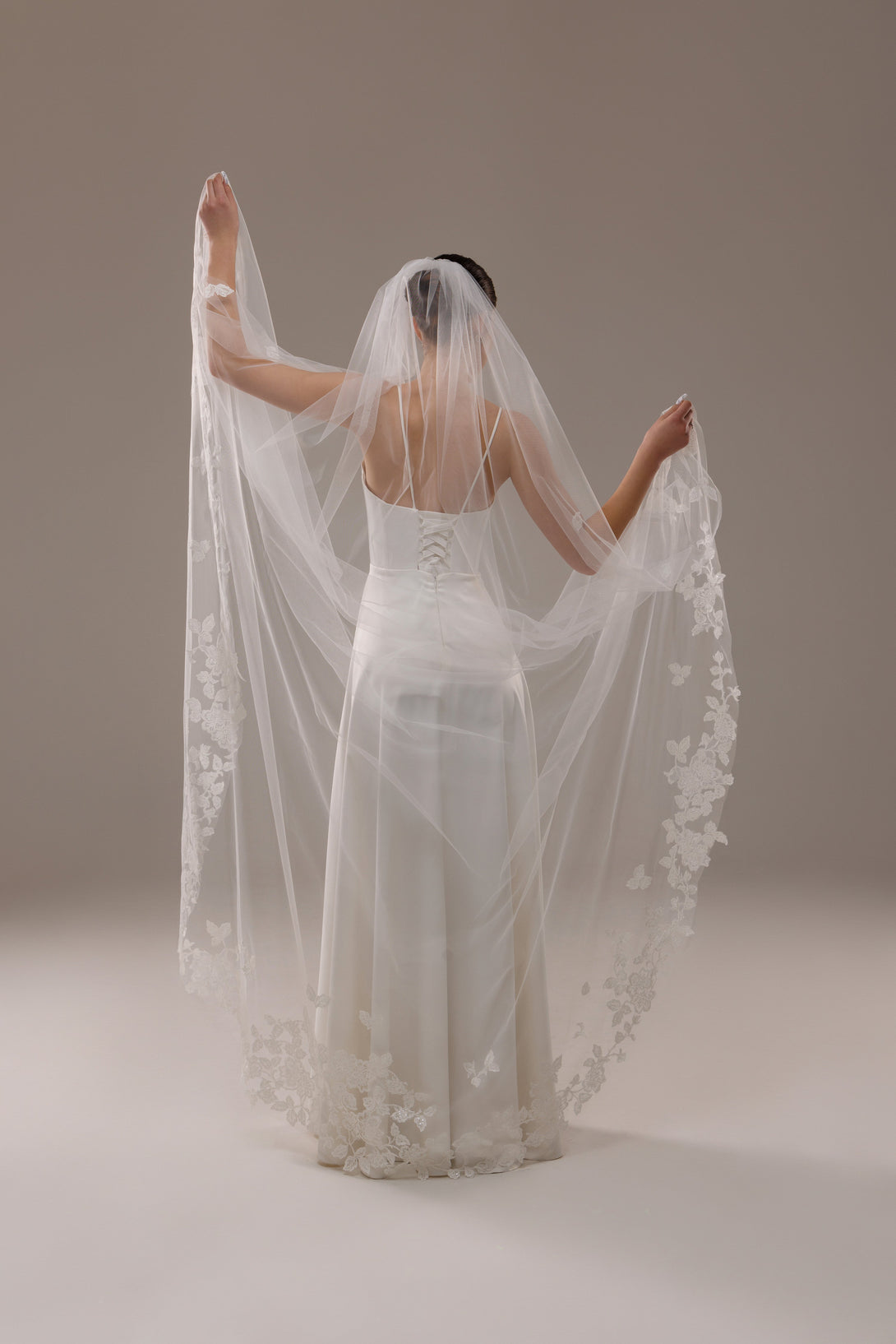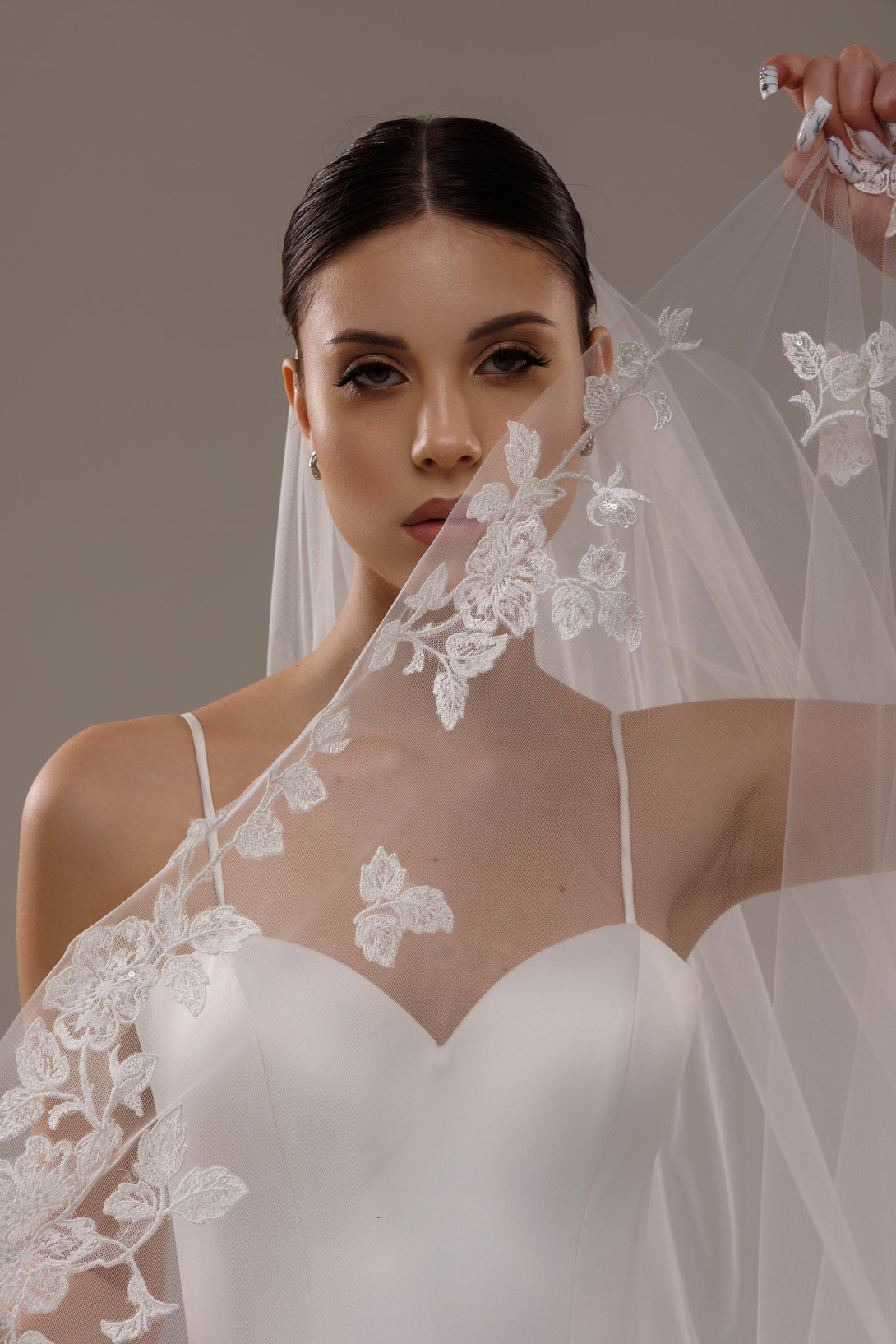 One layered classic lace trim bridal veil ✔︎Details: soft tulle one layered classic veil decorated with lace appliques attachment with a metal comb available in different lengths Width - 79"inch Color...