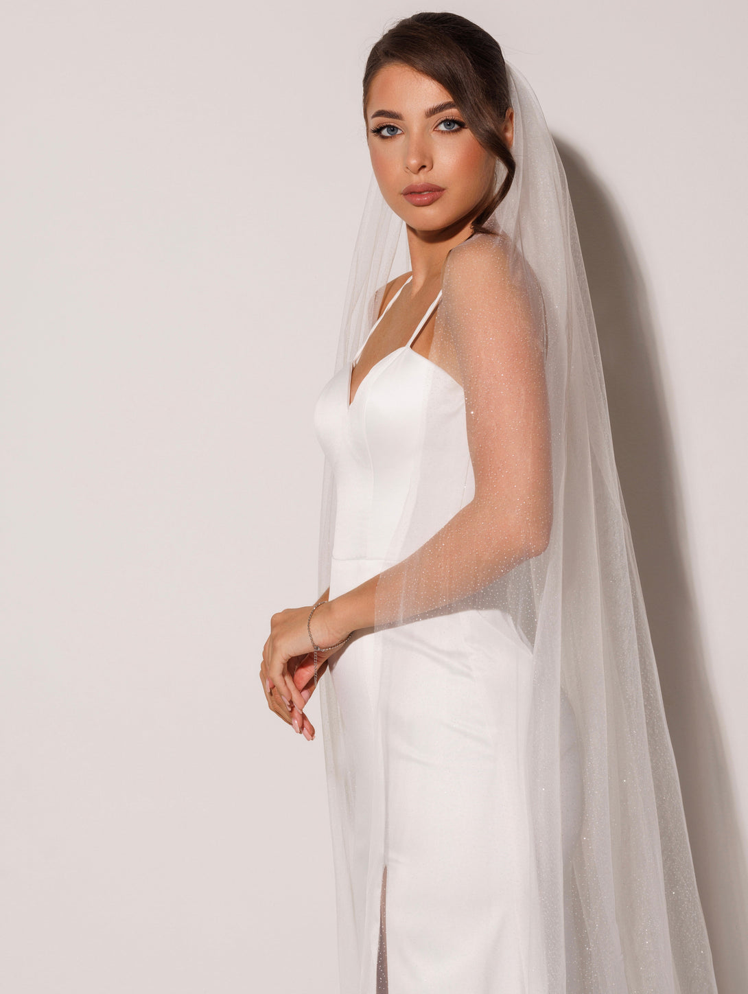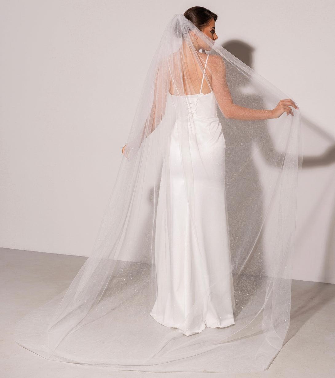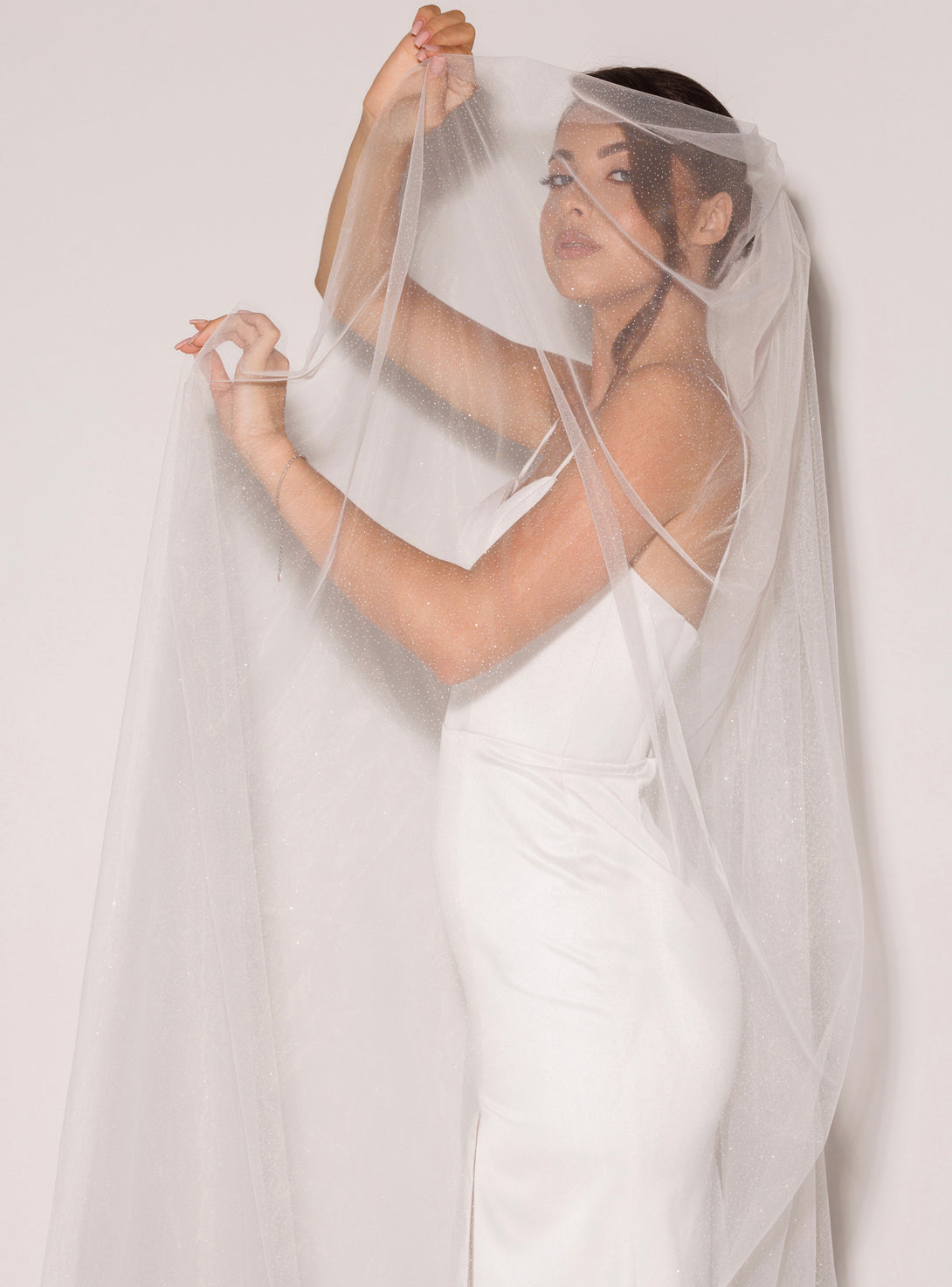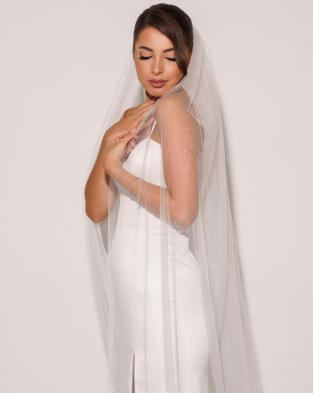 ✔︎Details: glitter tulle one layered classic veil attachment with a metal comb available in different lengths Width - 300 cm (120'') Size on the photo - 250 cm (99'')