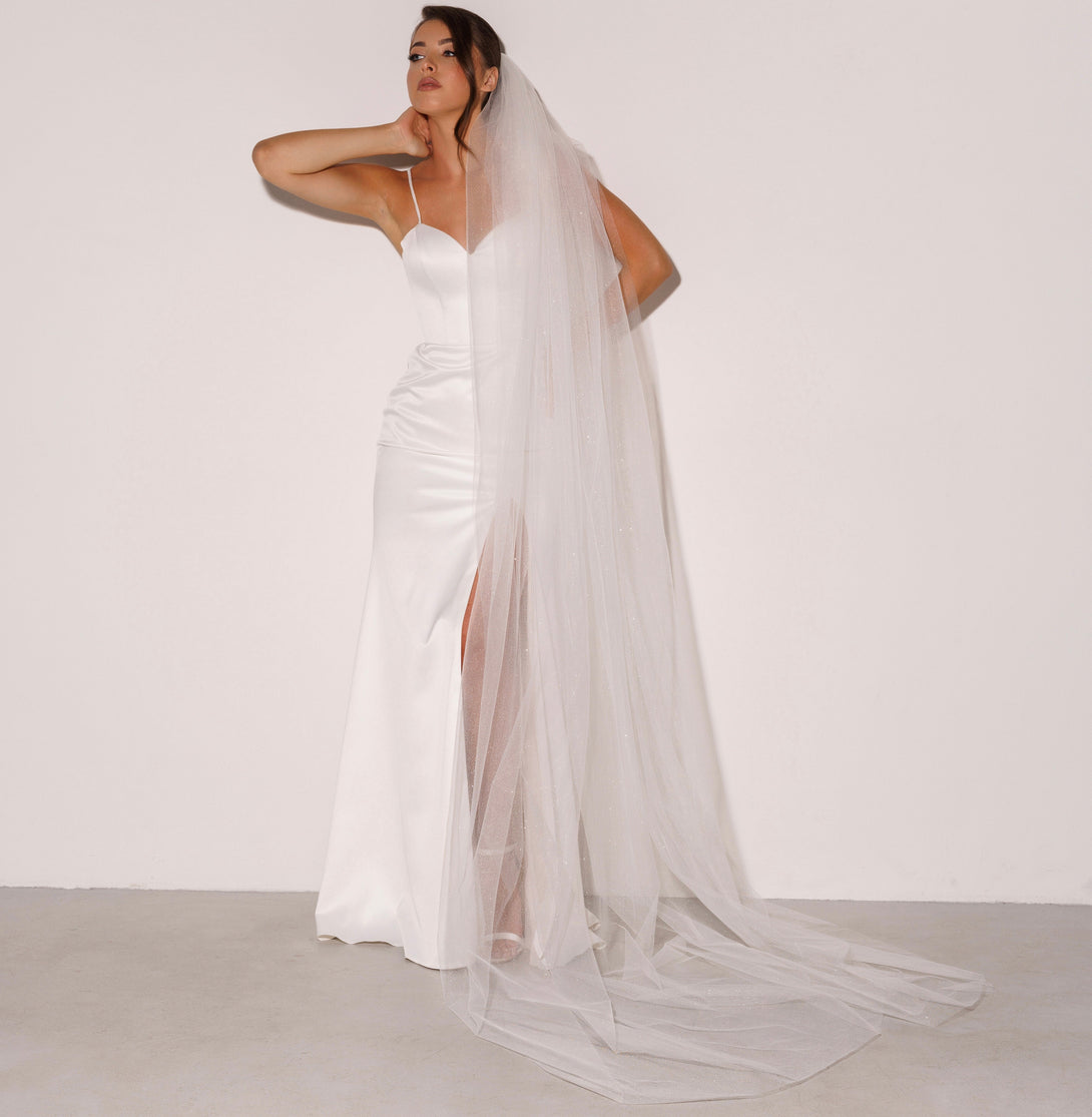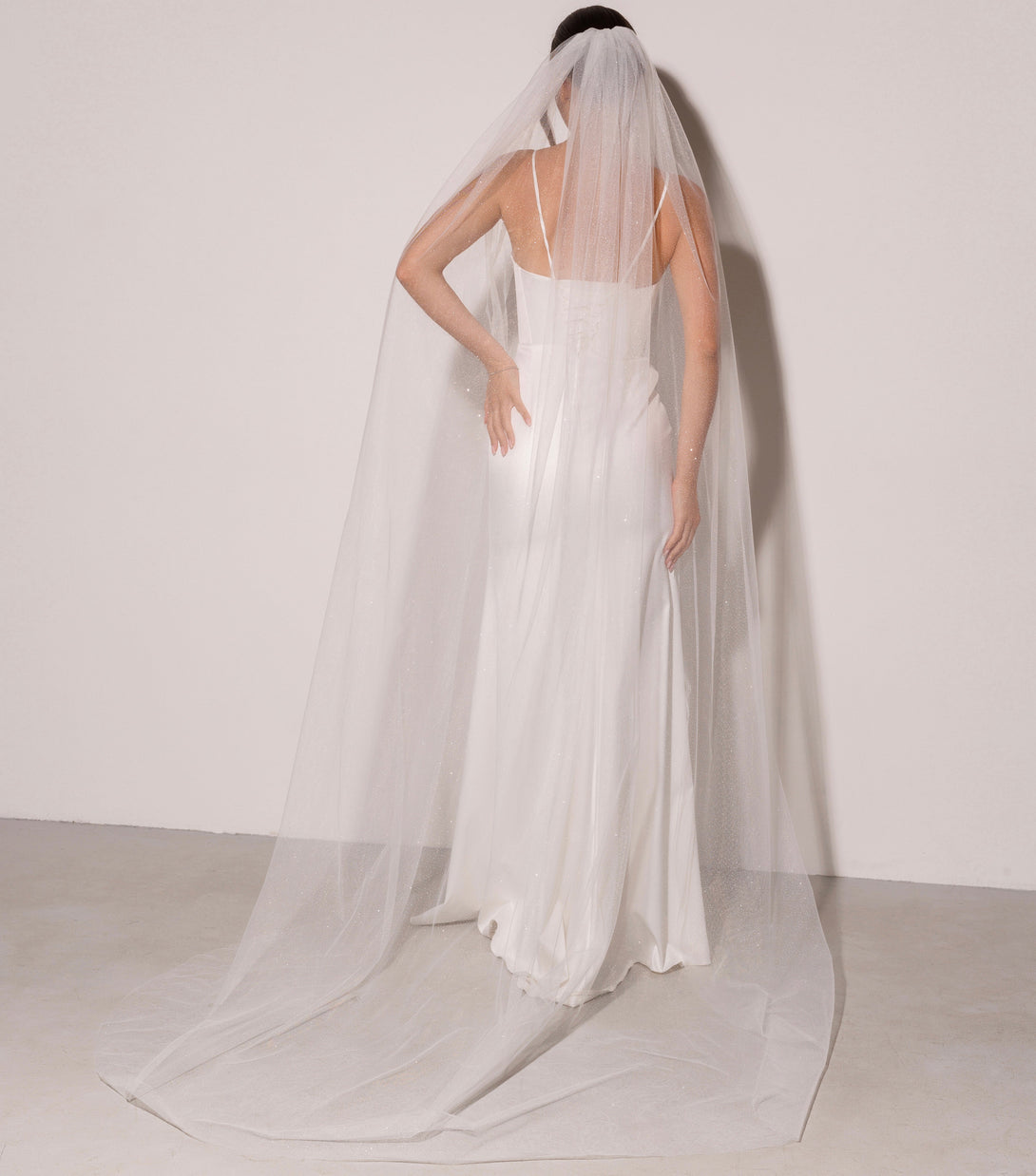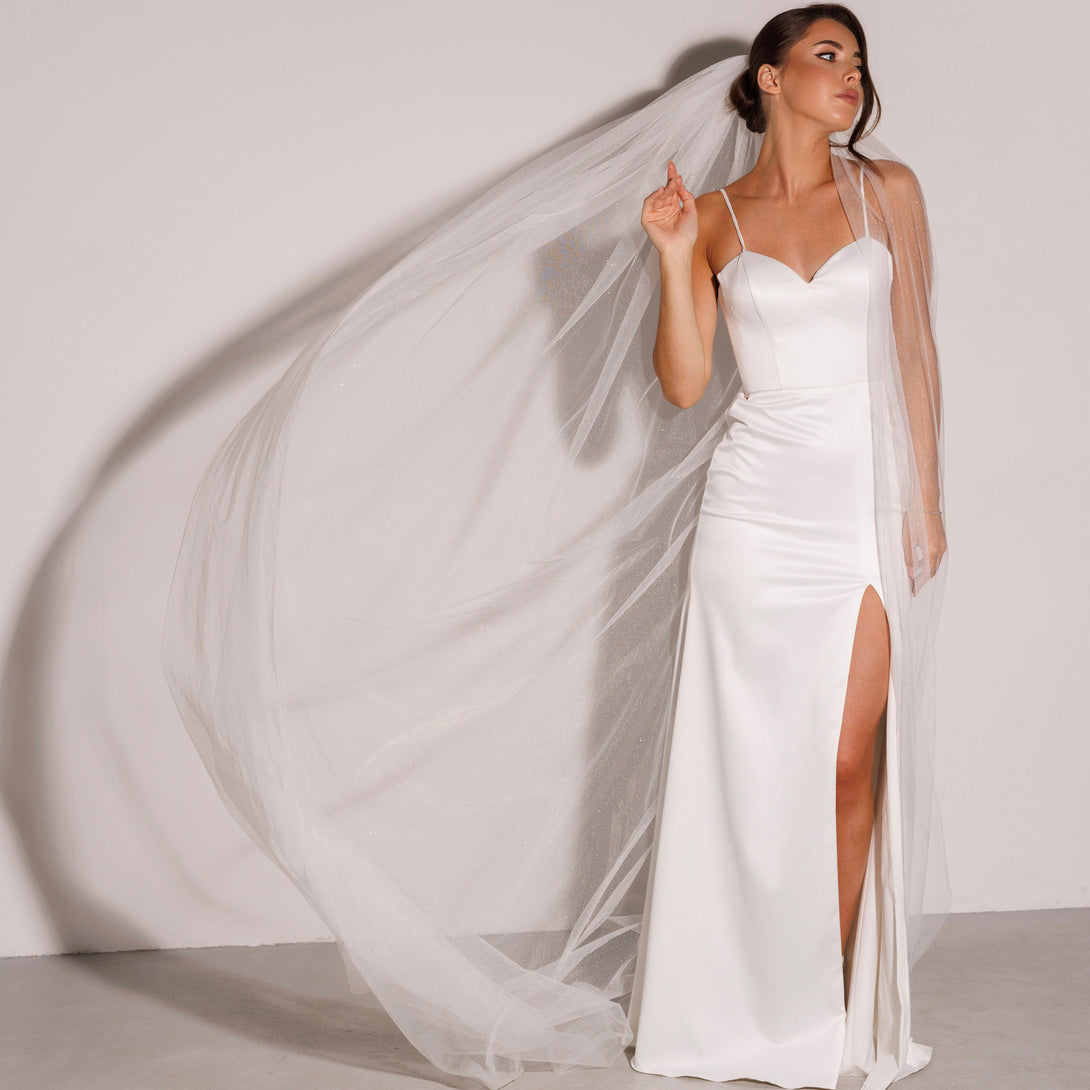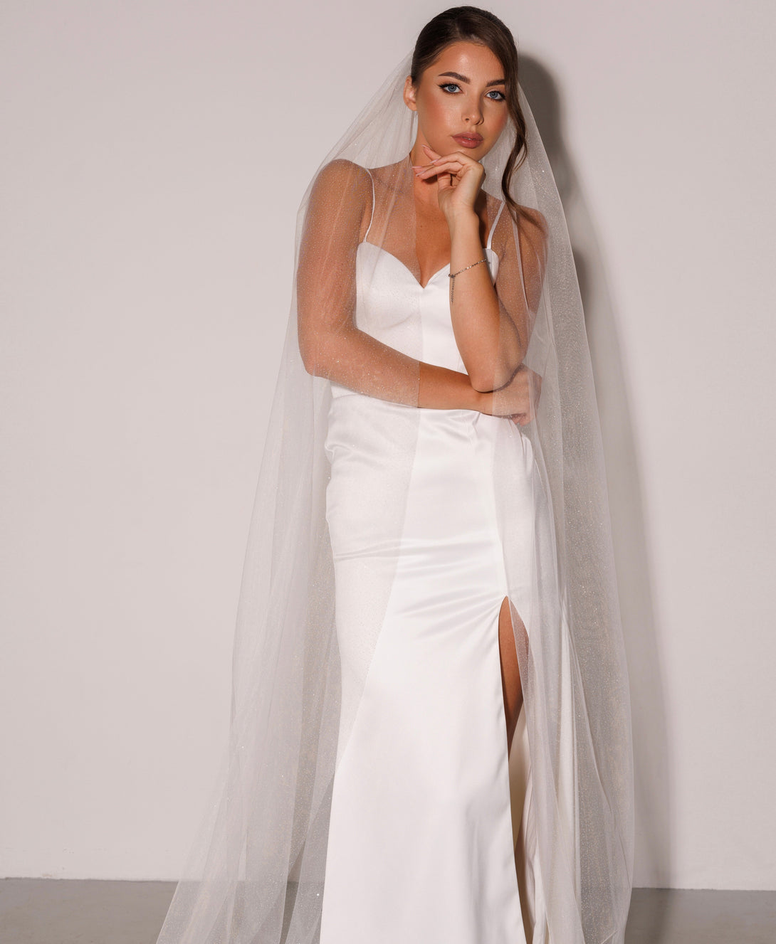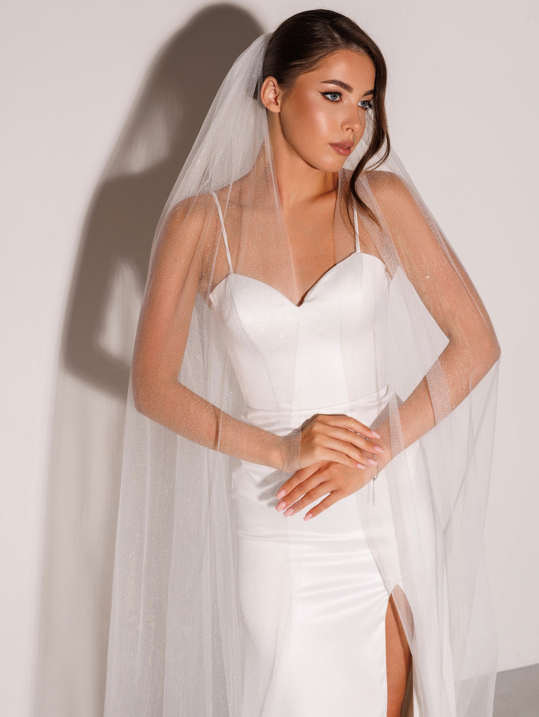 ✔︎Details: glitter tulle one layered classic veil attachment with a metal comb available in different lengths Width - 300 cm (120'') Size on the photo - 250 cm (99'')