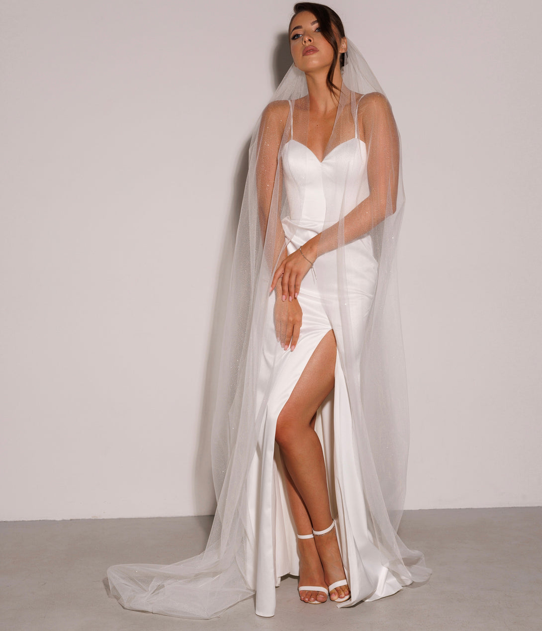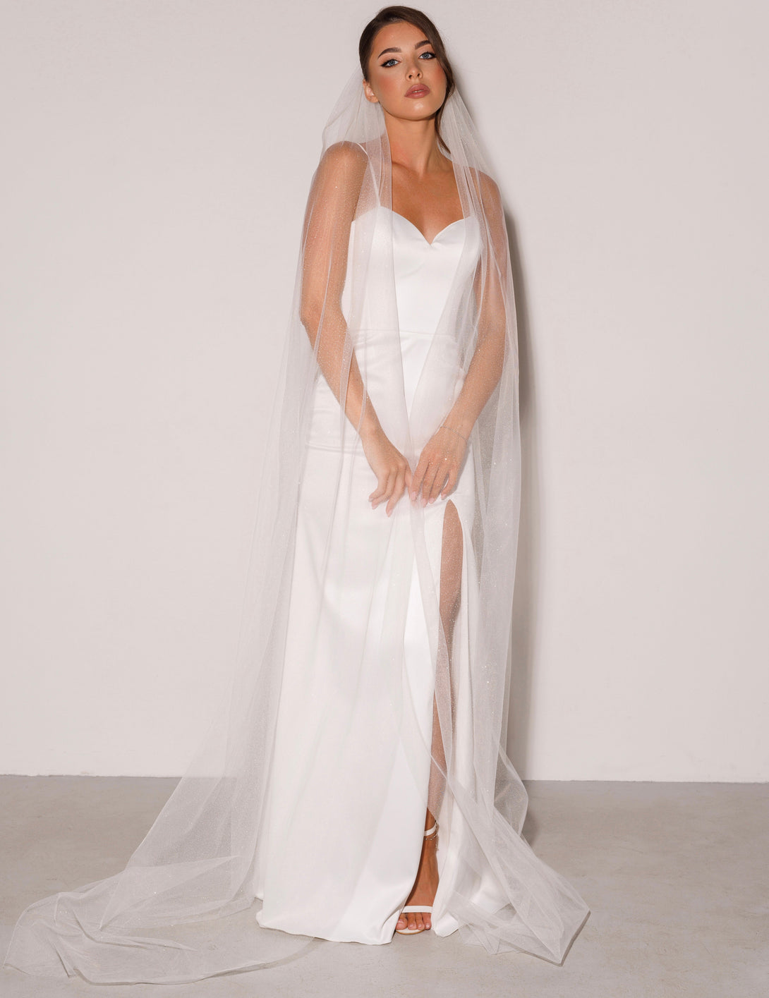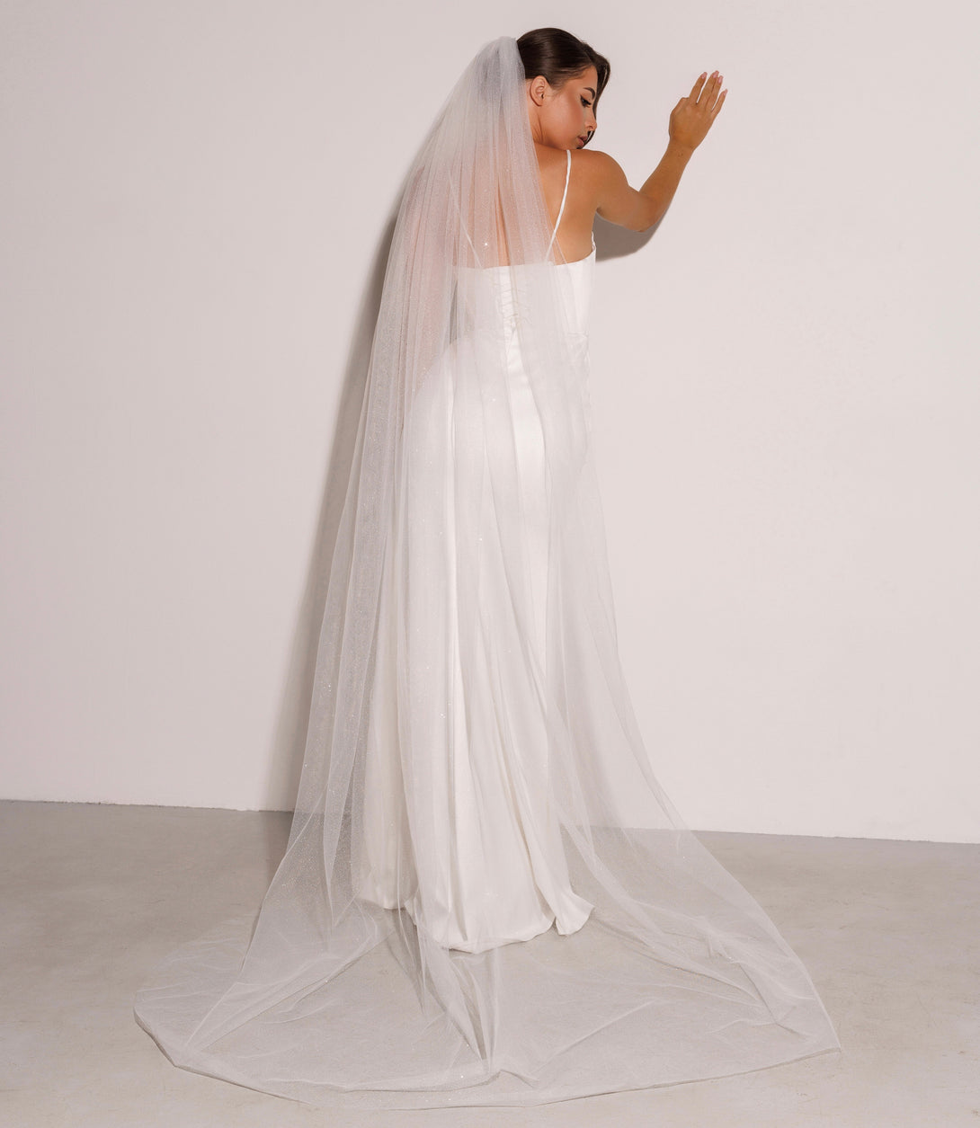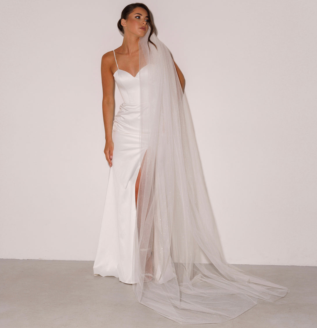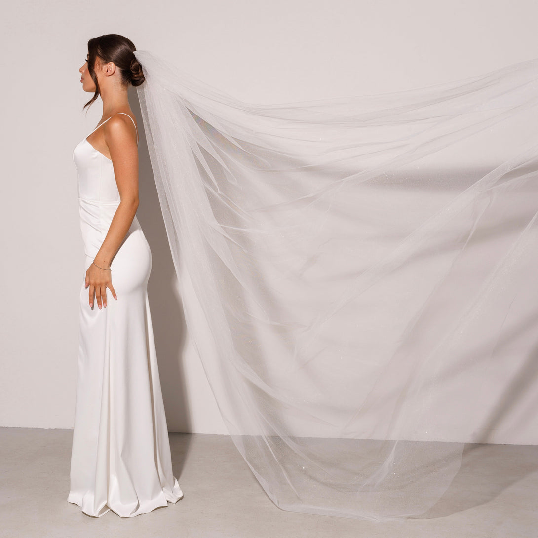 ✔︎Details: glitter tulle one layered classic veil attachment with a metal comb available in different lengths Width - 300 cm (120'') Size on the photo - 250 cm (99'')