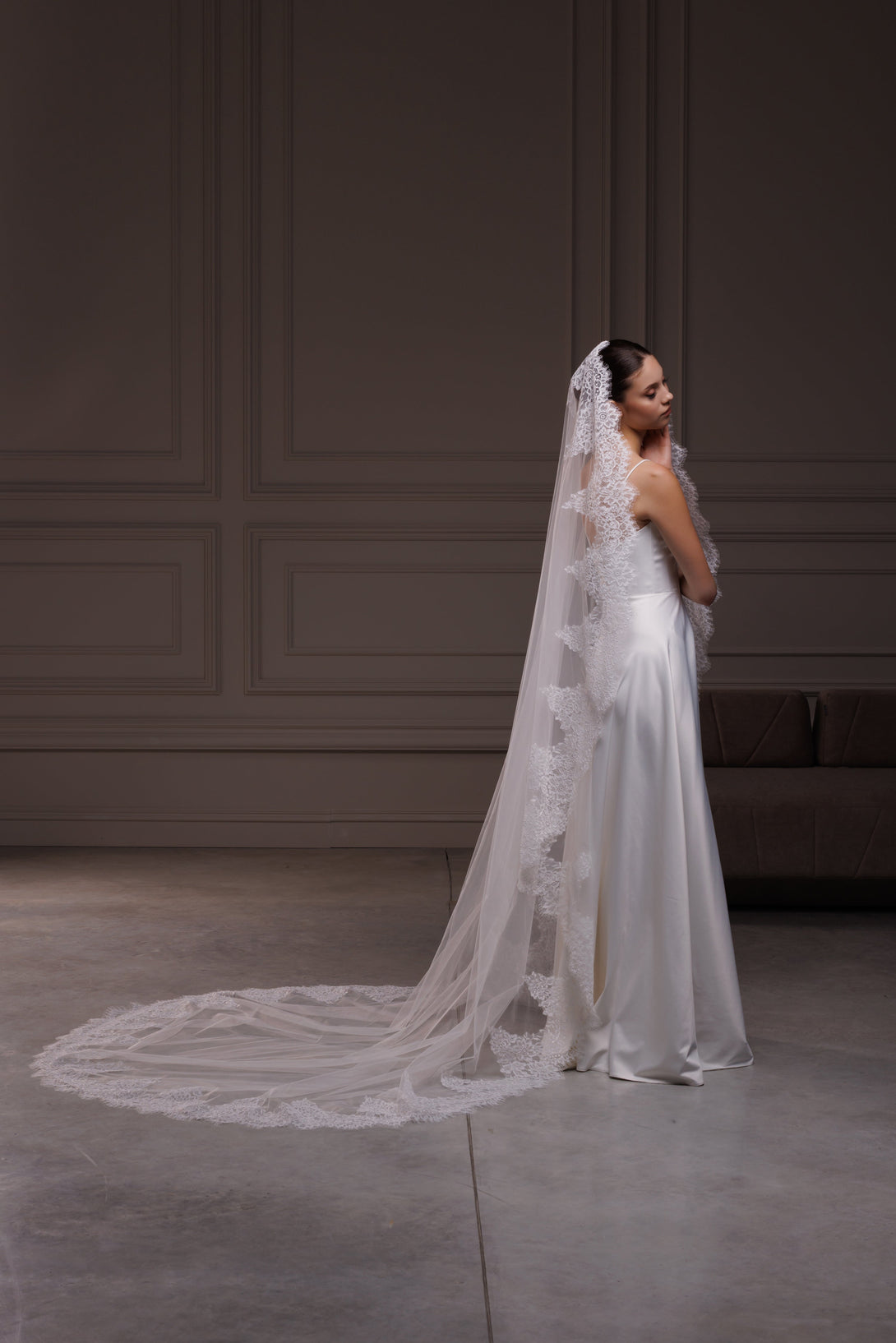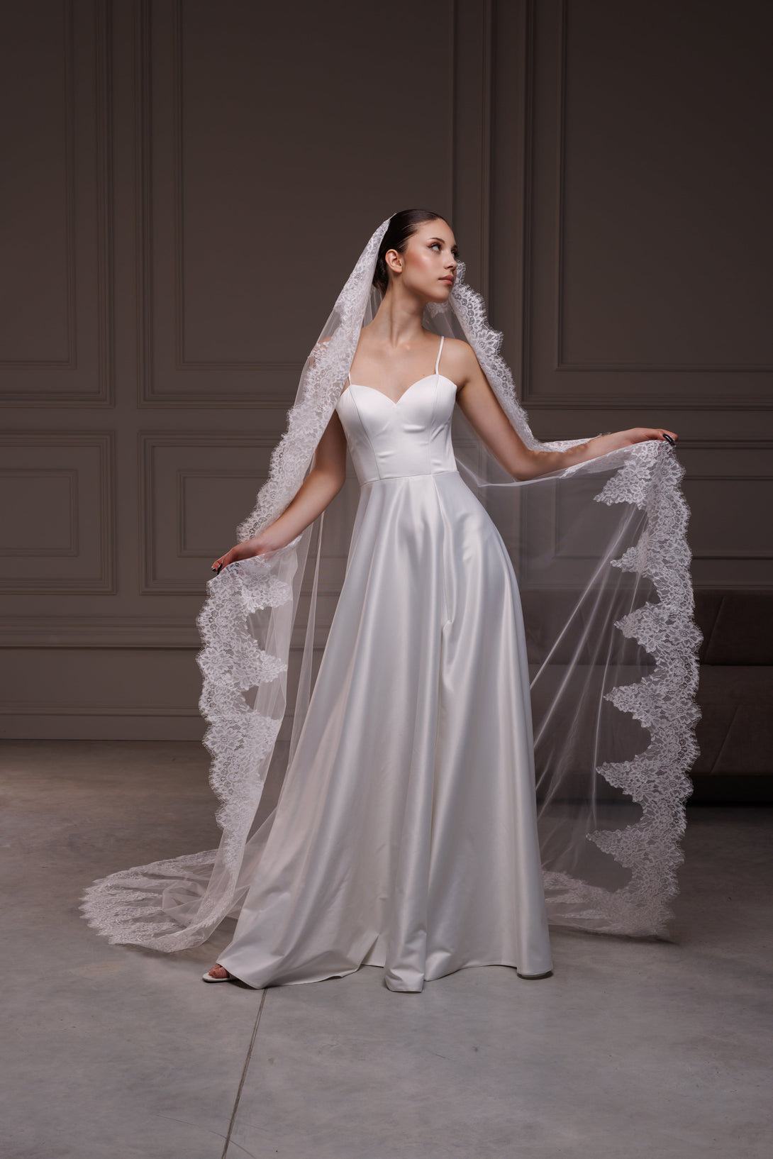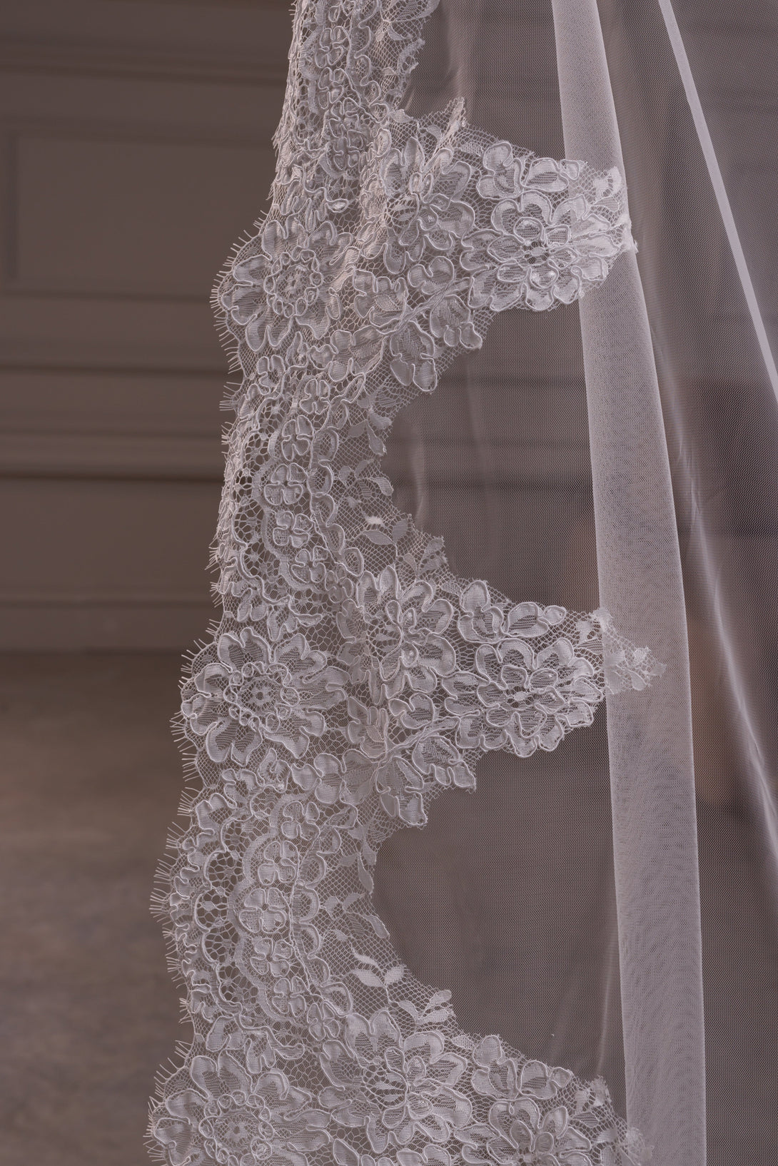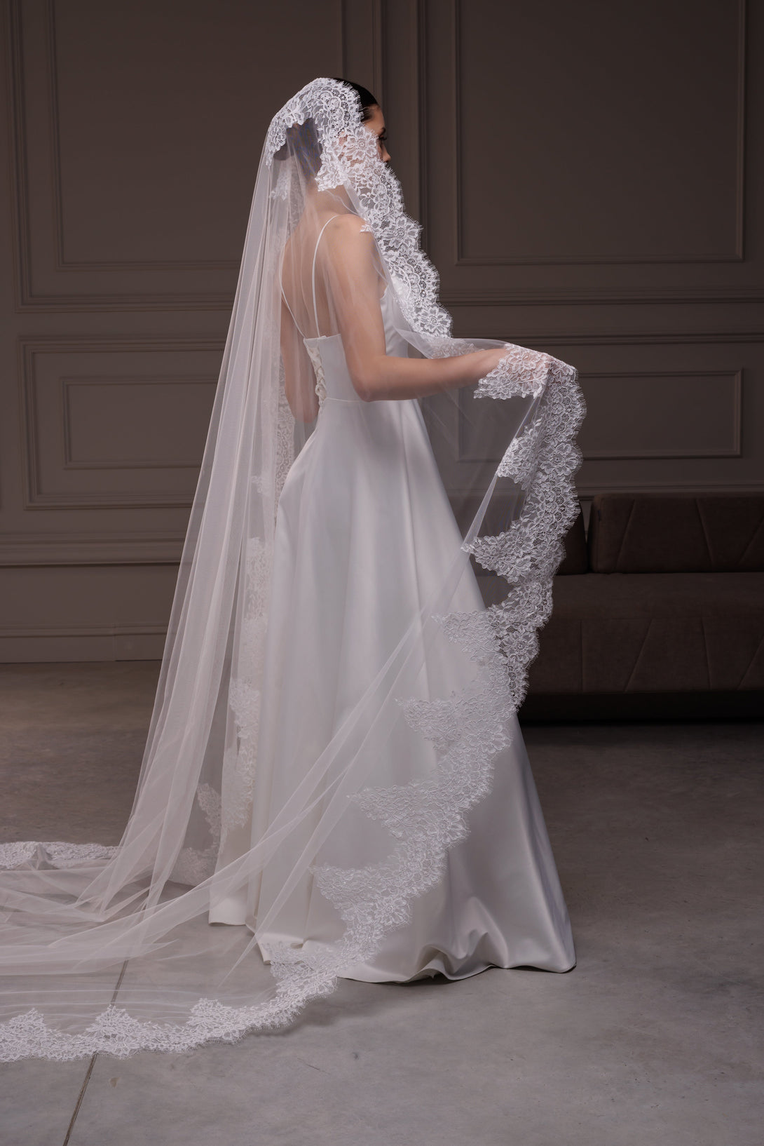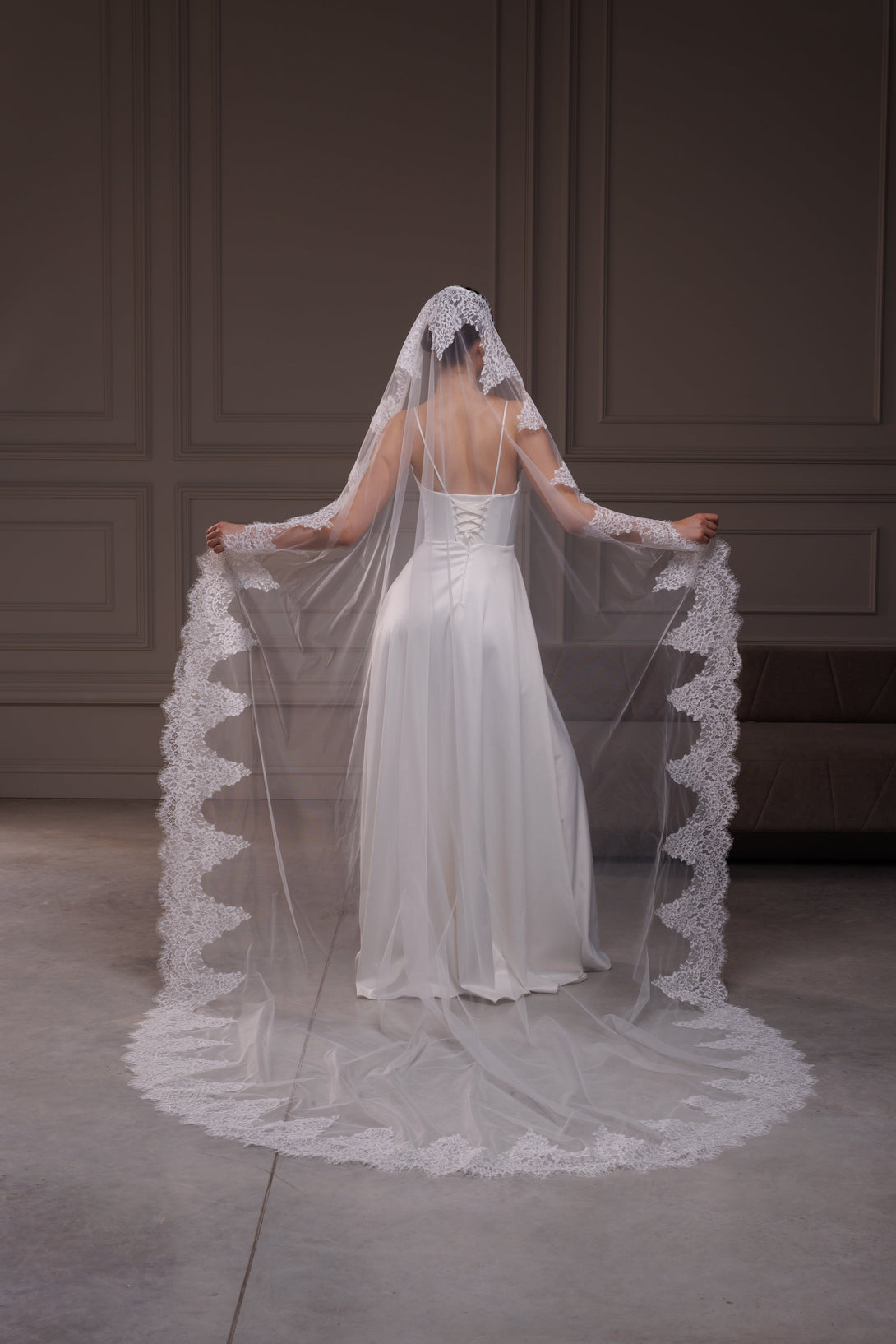 Mantilla lace trim veil ✔︎Details: soft tulle one layered rounded mantilla veil decoration with lace trim available in different lengths Width - 150-200 cm (59-79") Color - ivory is the basic...