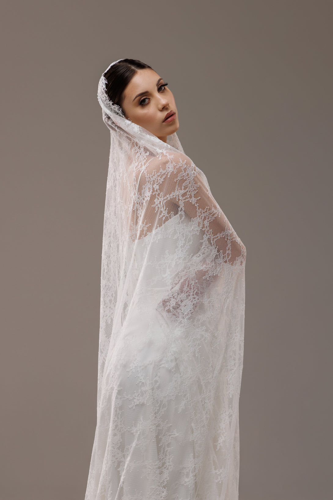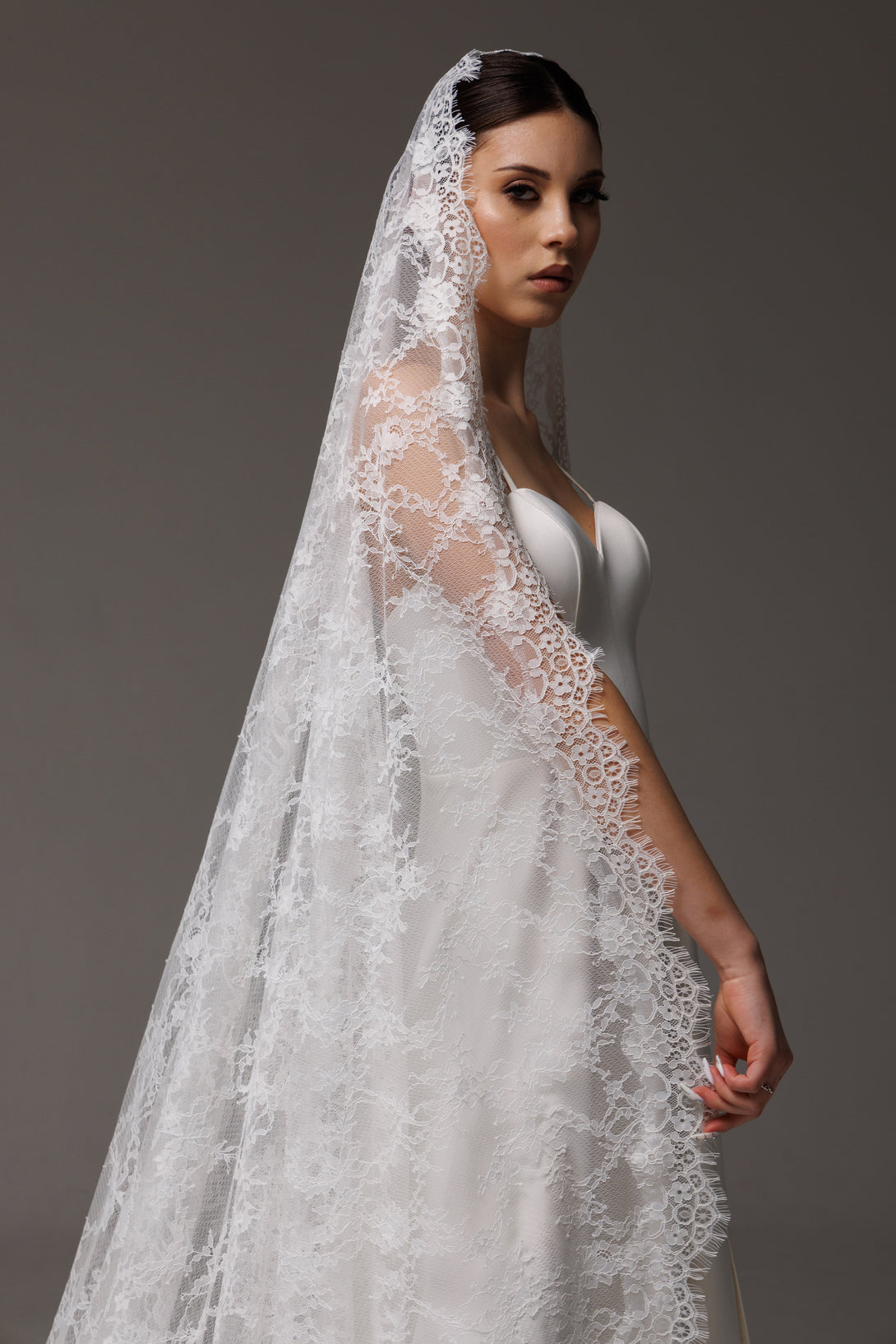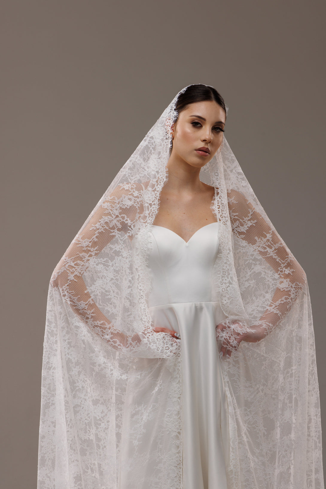 Wide mantilla Spanish veil made of solid chantilly lace, V-2507