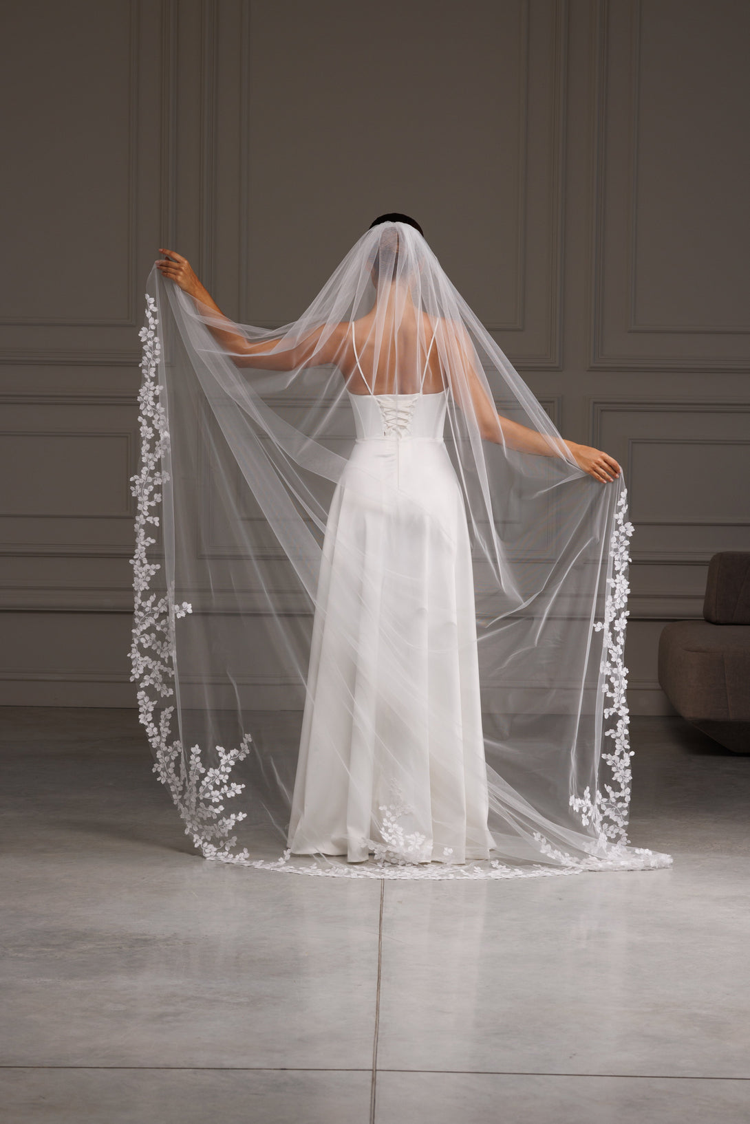 Add timeless elegance to your bridal look with this one-tier lace veil. Made from soft tulle and finished with a delicate lace edge, it perfectly complements both modern and classic wedding gowns.