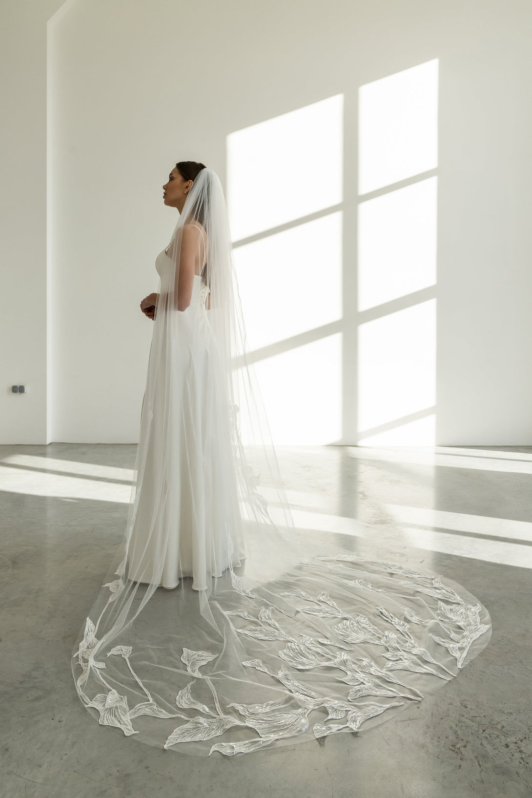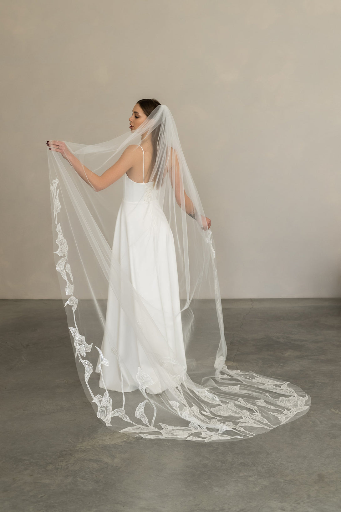 A modern and absolutely beautiful veil with gorgeous magnolia flowers.
