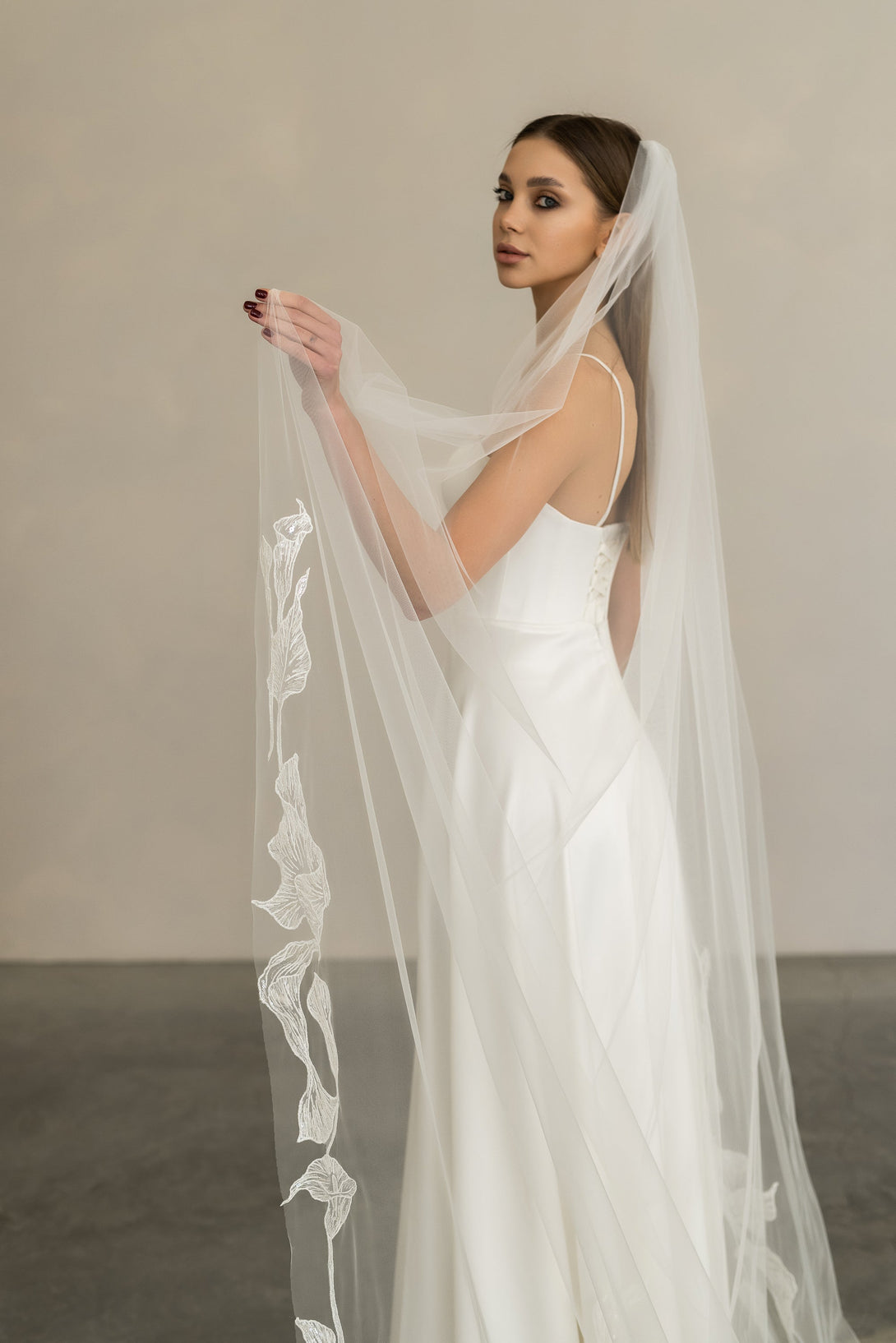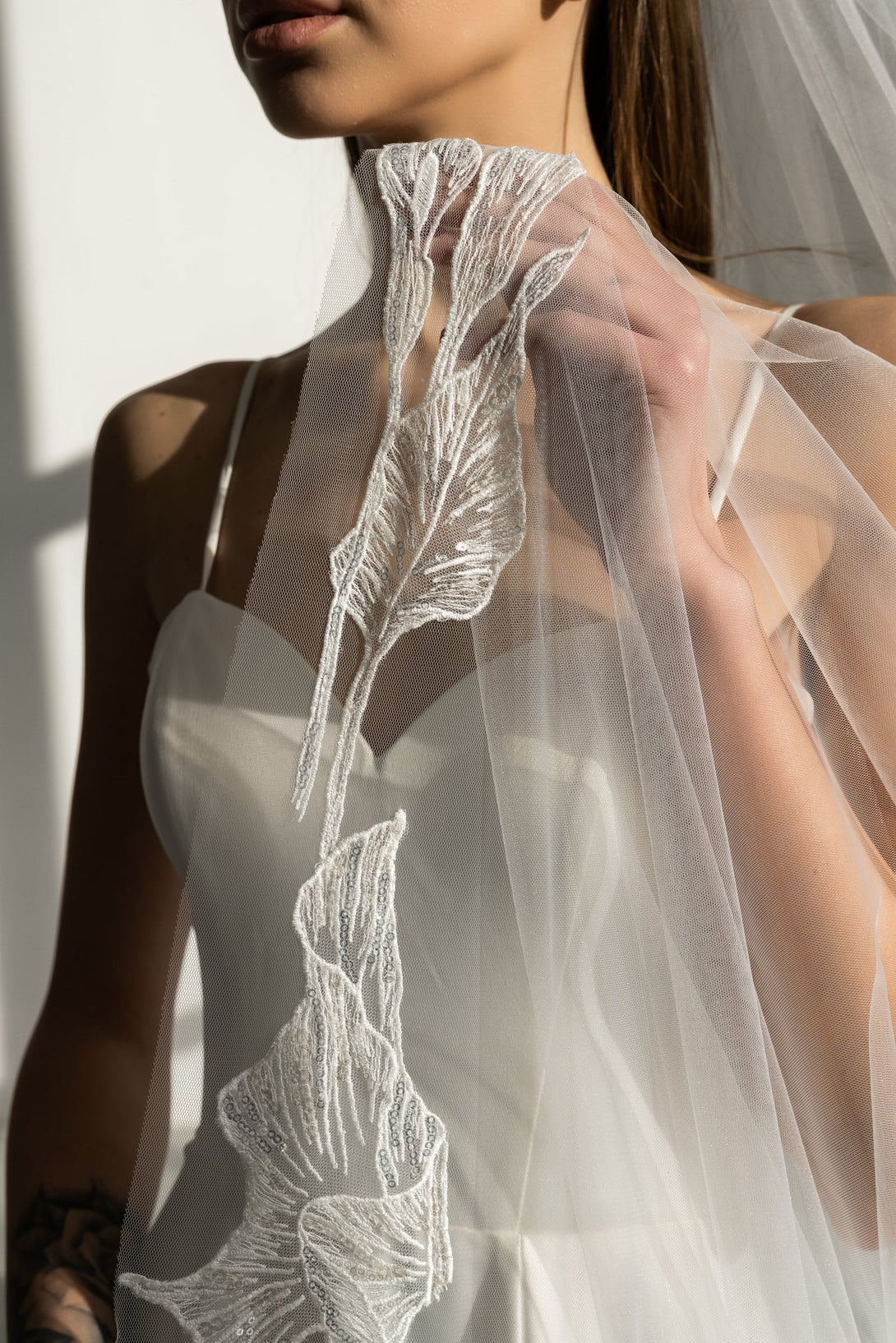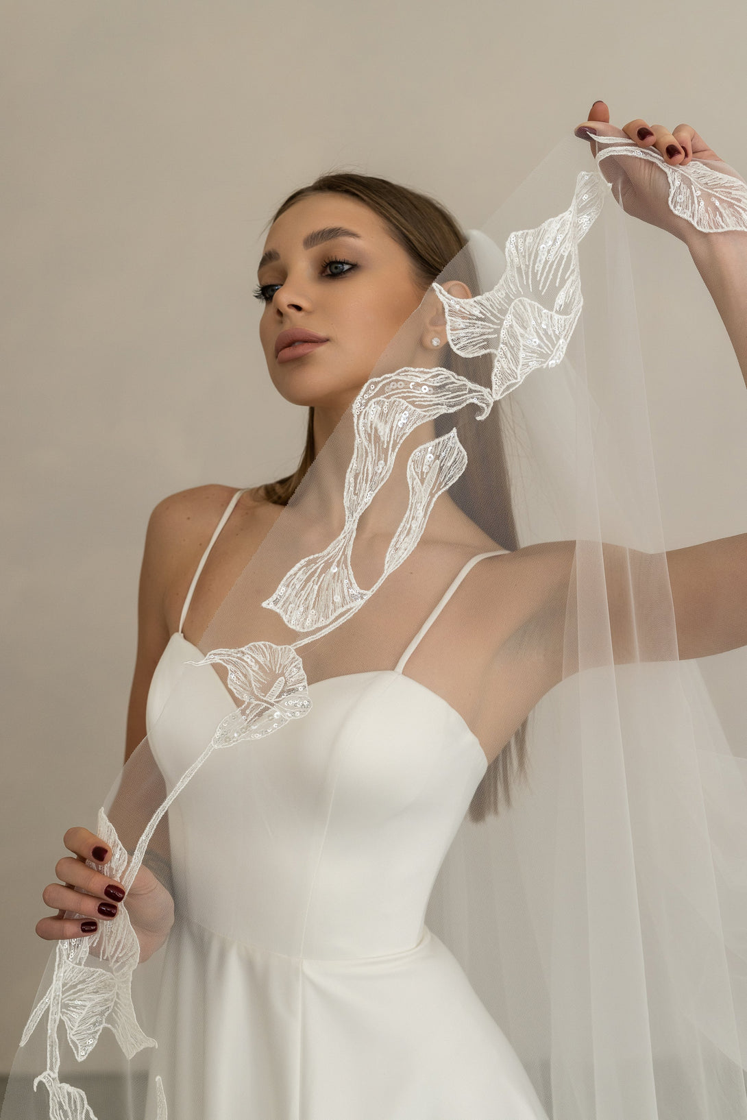 A modern and absolutely beautiful veil with gorgeous magnolia flowers. ✔︎Details: soft tulle one layered classic veil decoration with lace applications with sequins attachment with a metal comb Width - 79"...