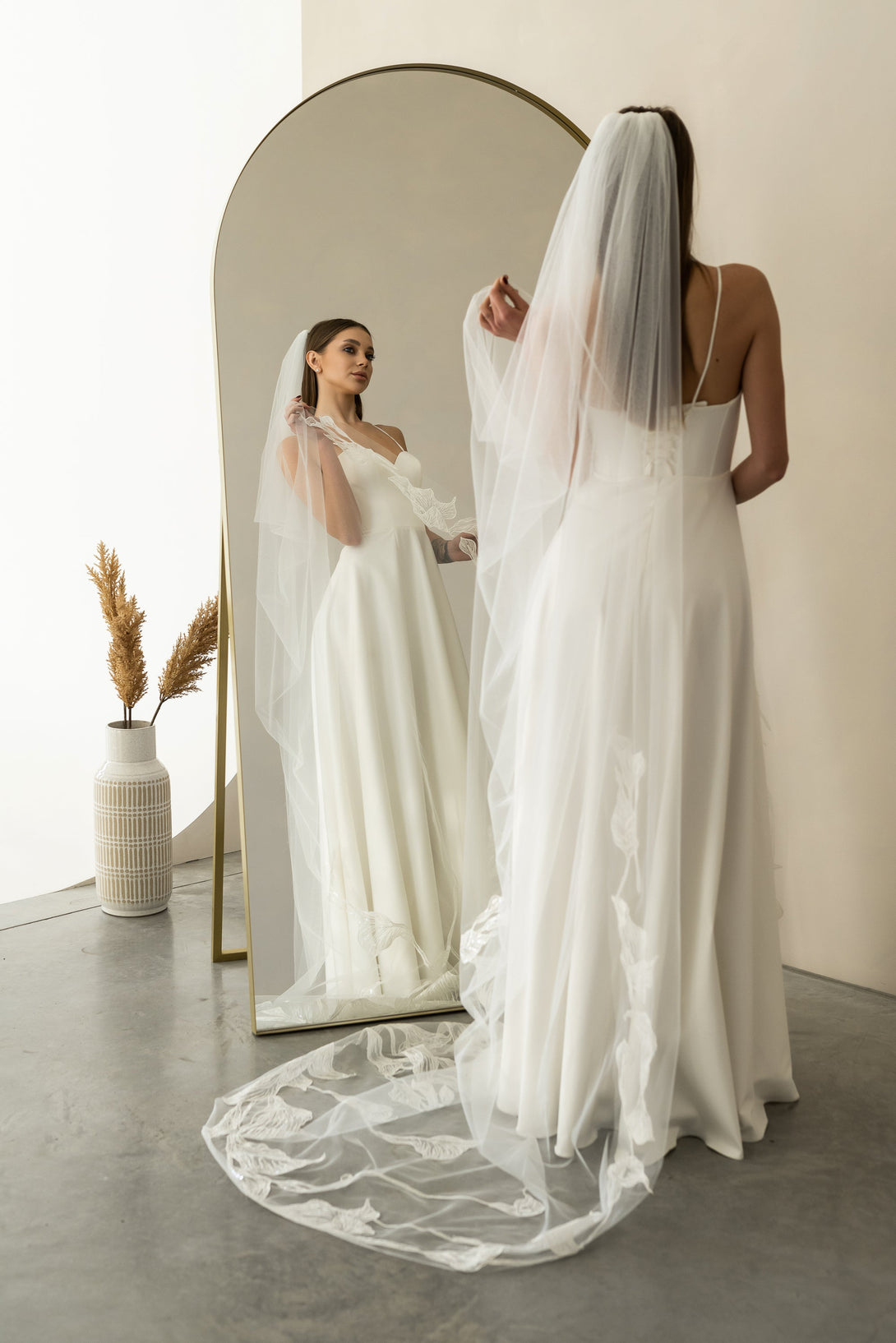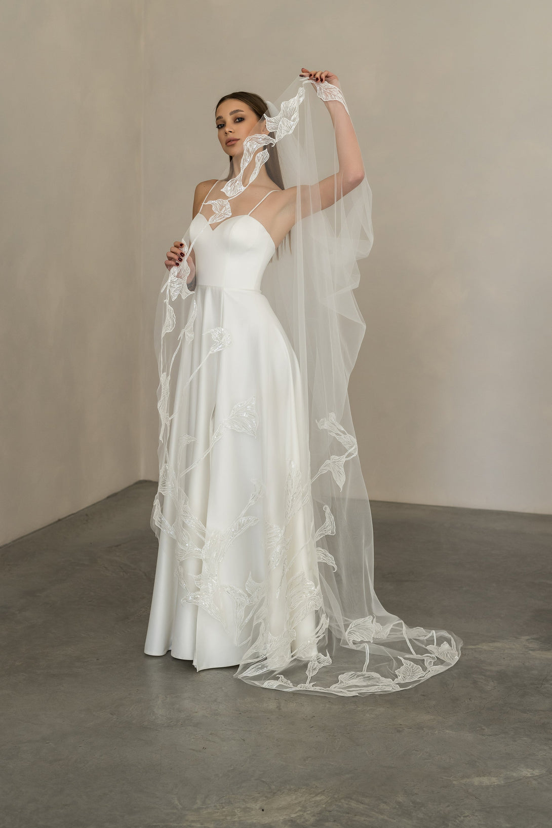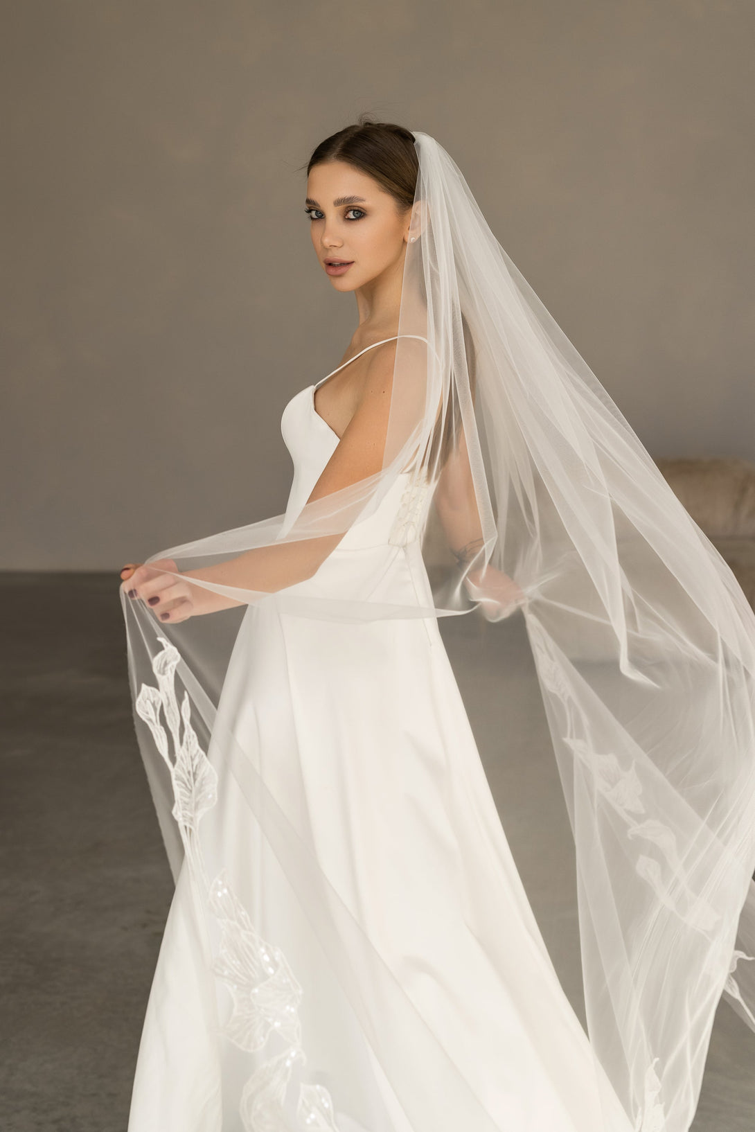 A modern and absolutely beautiful veil with gorgeous magnolia flowers. ✔︎Details: soft tulle one layered classic veil decoration with lace applications with sequins attachment with a metal comb Width - 79"...