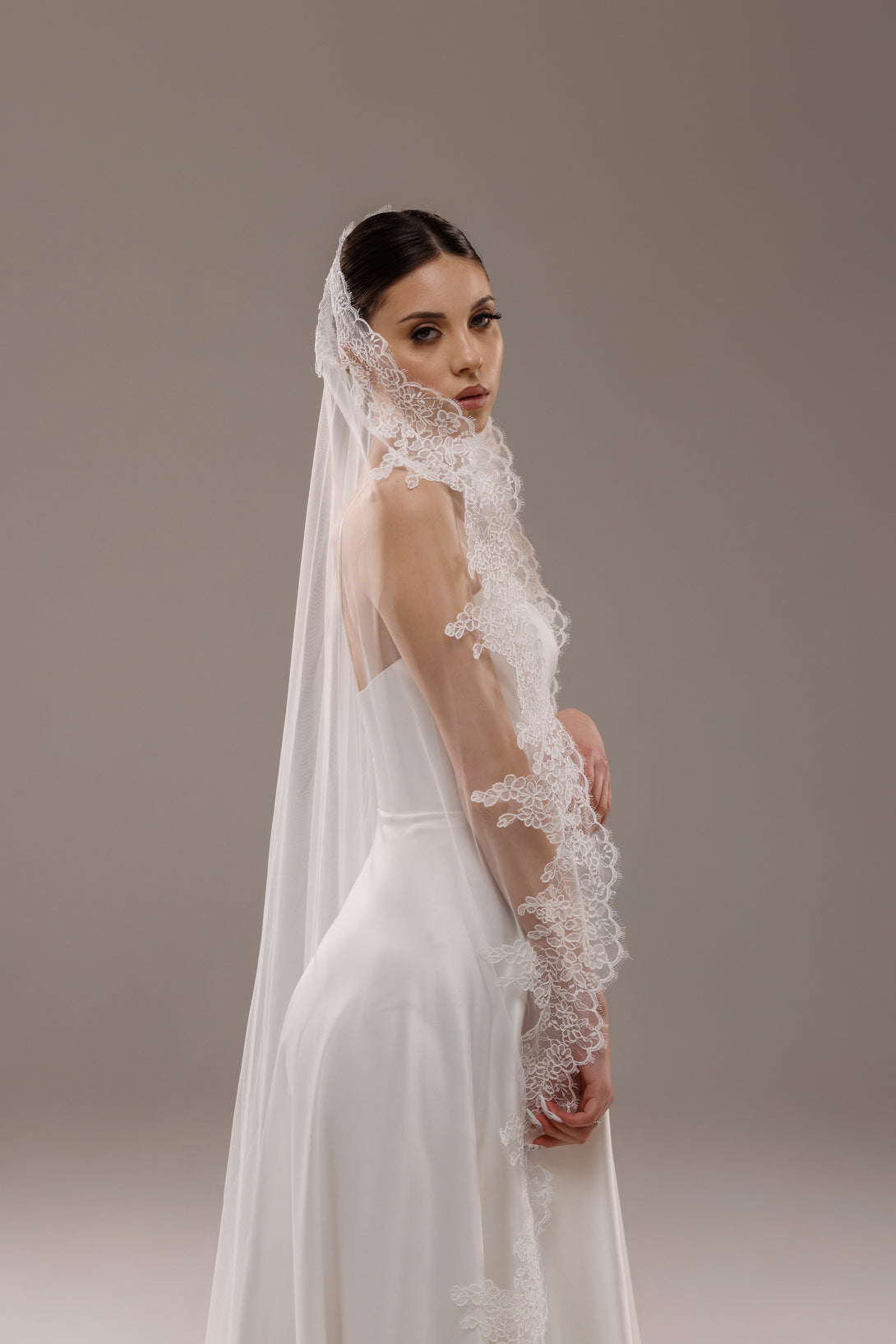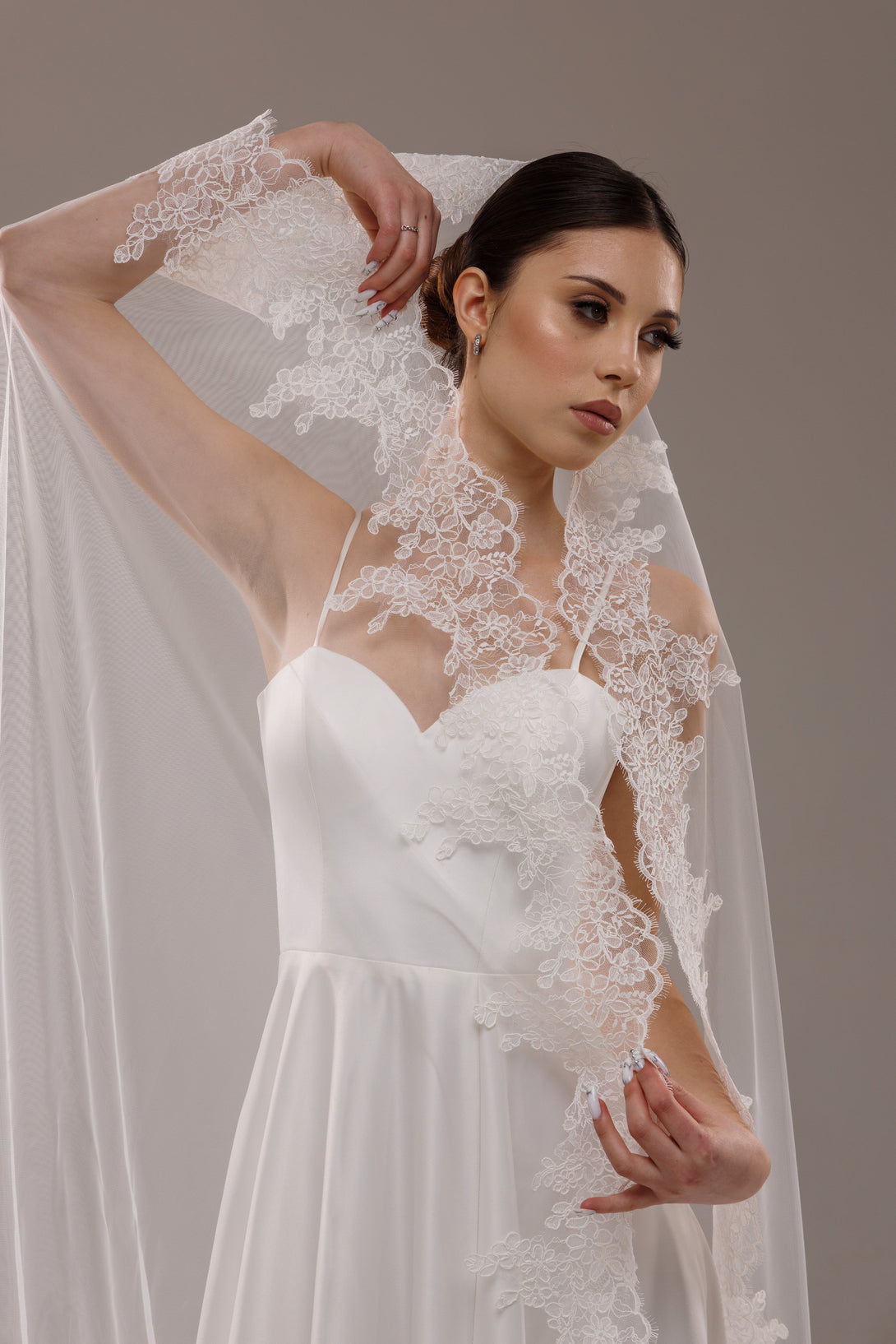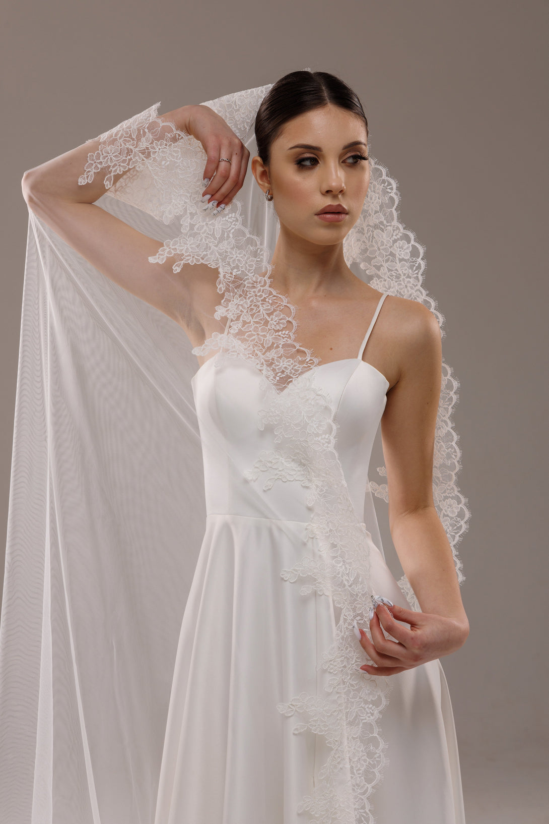 Mantilla lace trim veil ✔︎Details: soft tulle one layered rounded mantilla veil decoration with lace trim available in different lengths Width - 200 cm (79") Color - ivory is the basic...