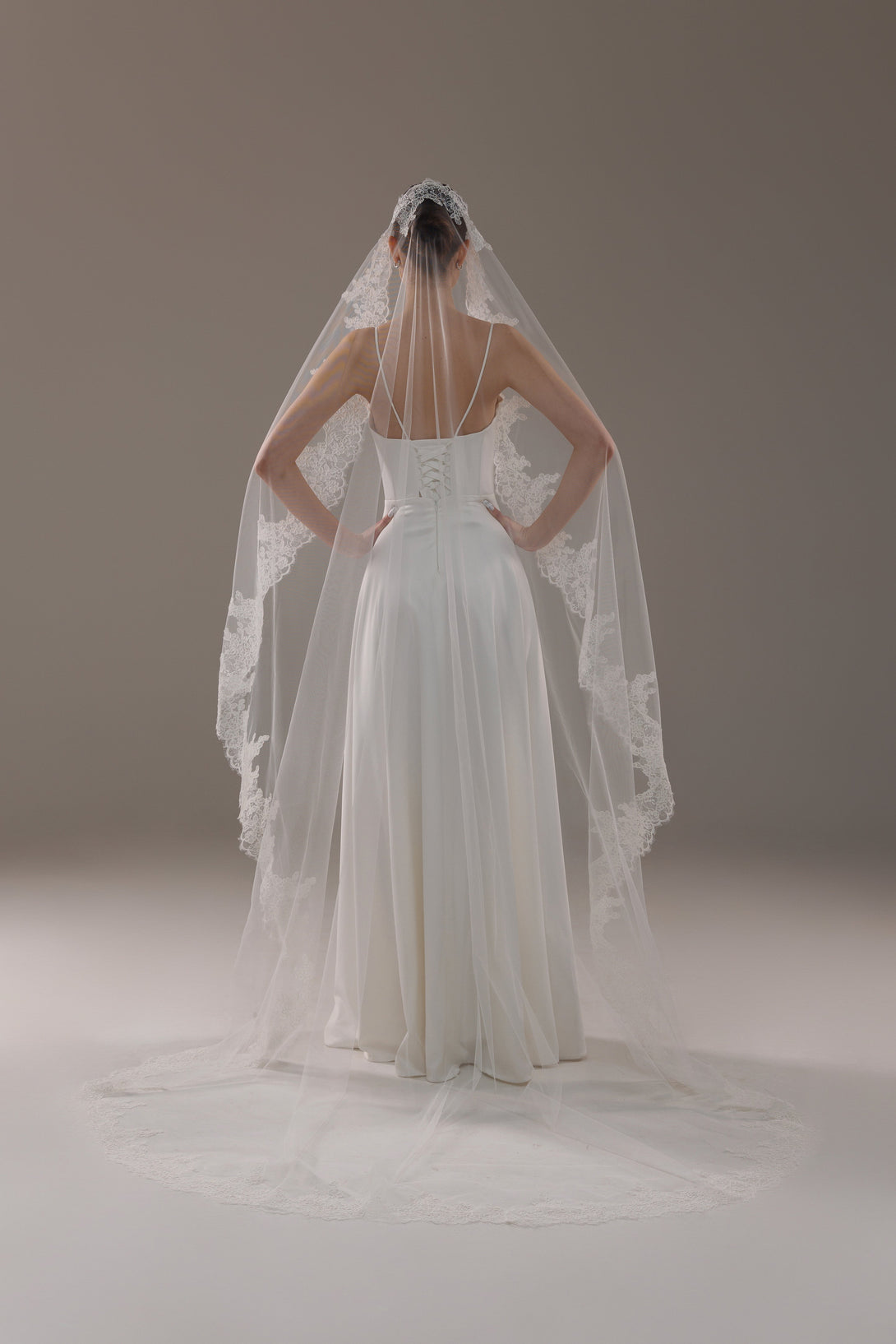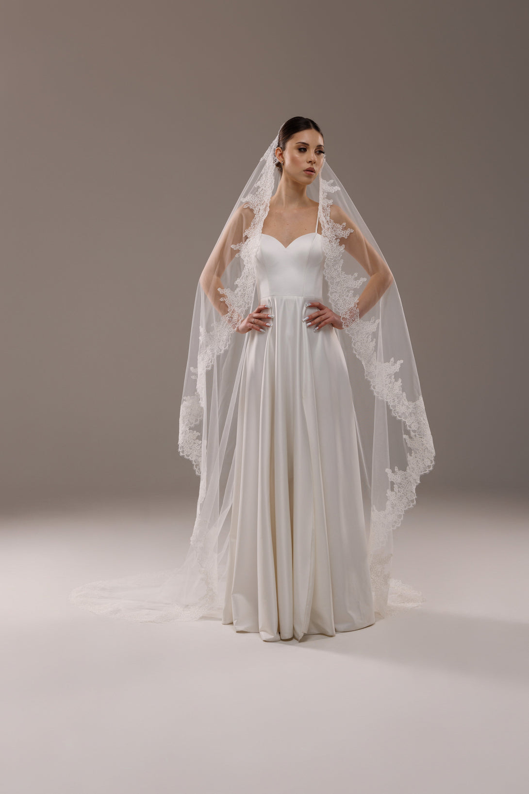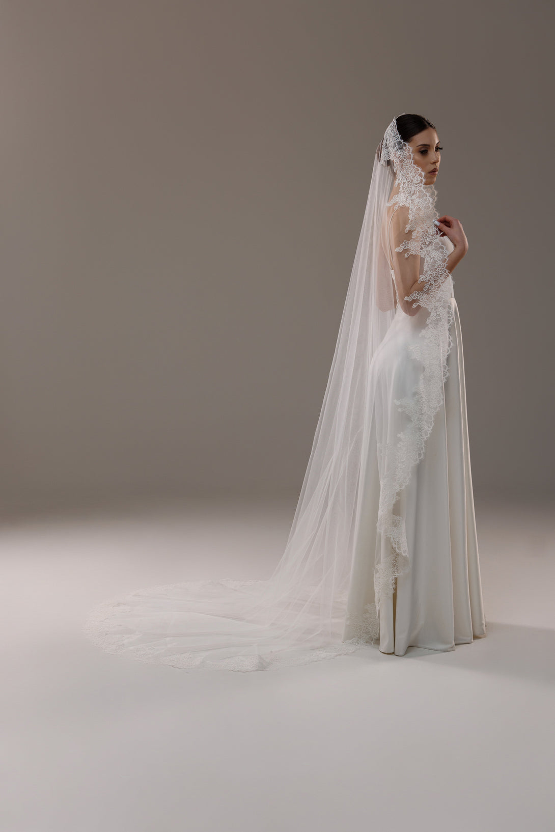 Mantilla lace trim veil ✔︎Details: soft tulle one layered rounded mantilla veil decoration with lace trim available in different lengths Width - 200 cm (79") Color - ivory is the basic...