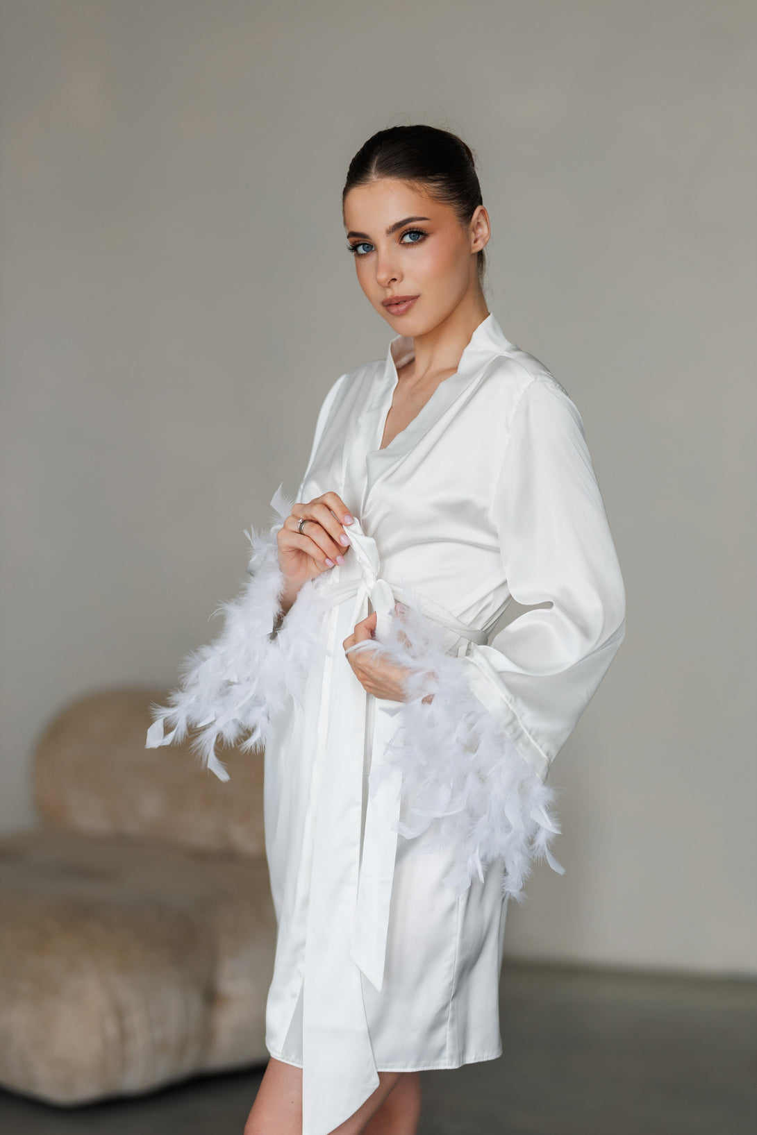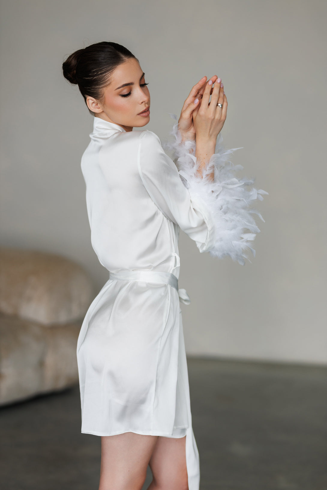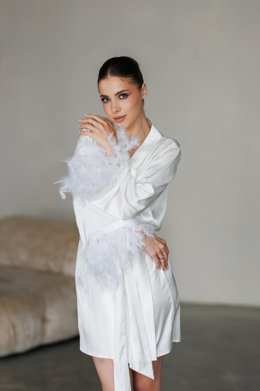 Romantic short silk bridal robe with delicate feathers — perfect for the wedding morning, photoshoot, or honeymoon.
