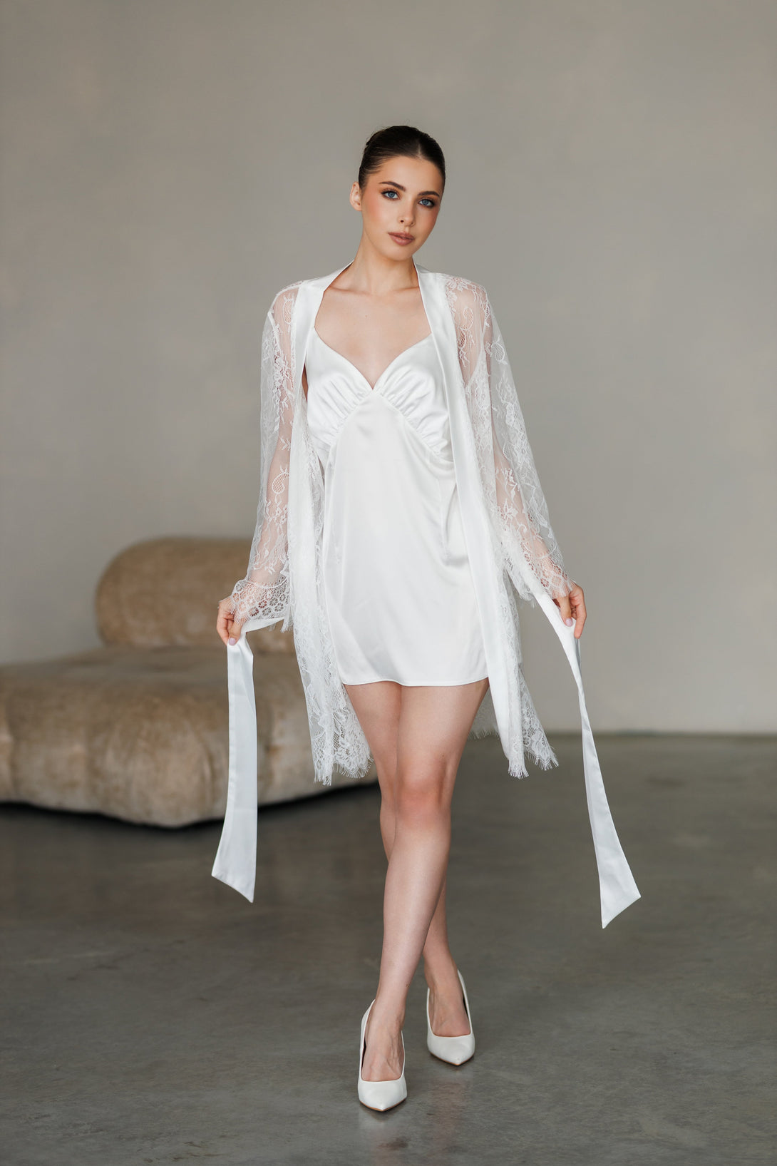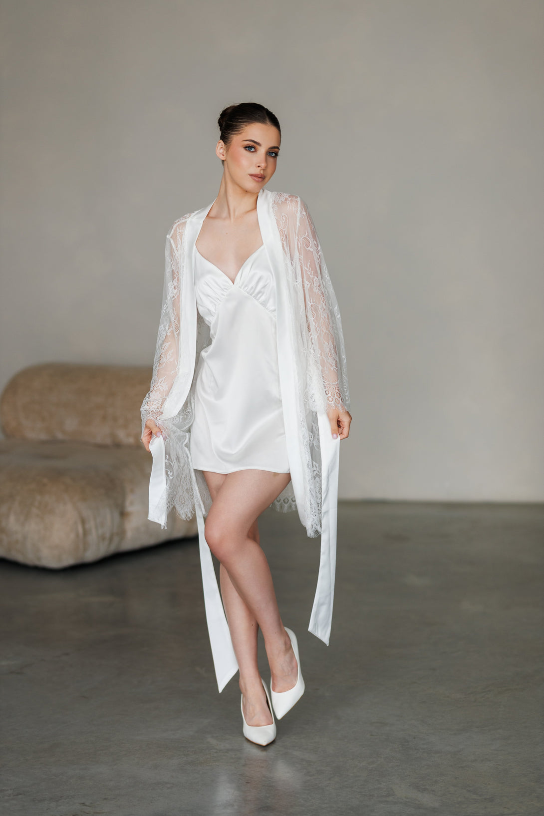 Transparent Lace Bridal Robe – Elegant Wedding Morning Robe for Bride ✔︎Details: chantilly lace attached with belt robe length is 35 inches (90cm) comes with a short slip dress length 32inches...