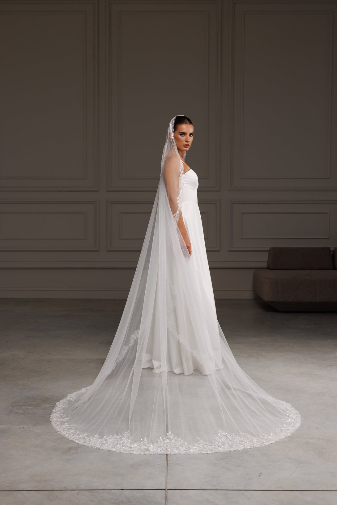 Mantilla lace trim veil ✔︎Details: soft tulle one layered rounded mantilla veil decorated with beaded lace trim attachment with a metal comb available in different lengths Width - 79" Color -...
