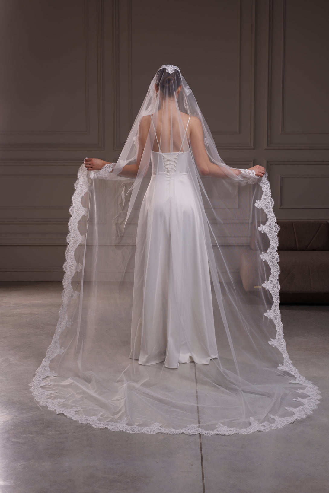 Width - 150 cm(59") and 200 cm (79") inch (veils with length until 200 cm (79") have width - 150 cm (59") and veils with length more than 230 cm (90") have width - 200 cm (79")Size in the photo - 275 cm (108")