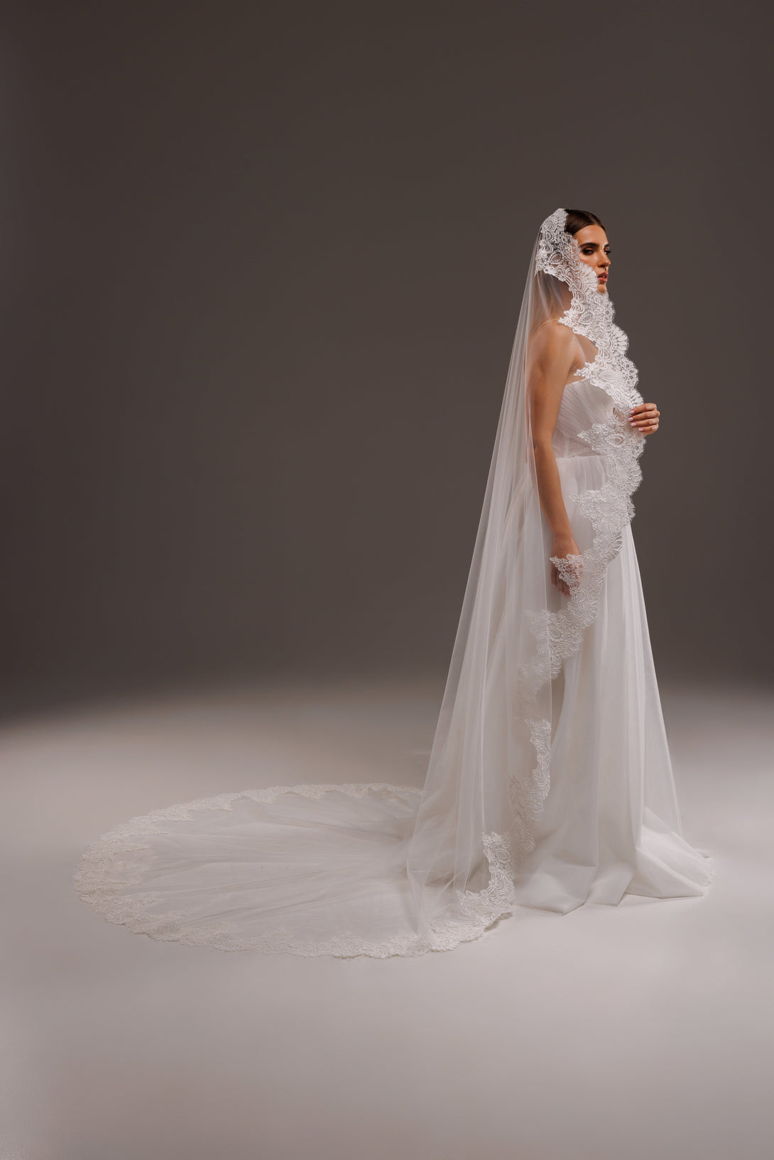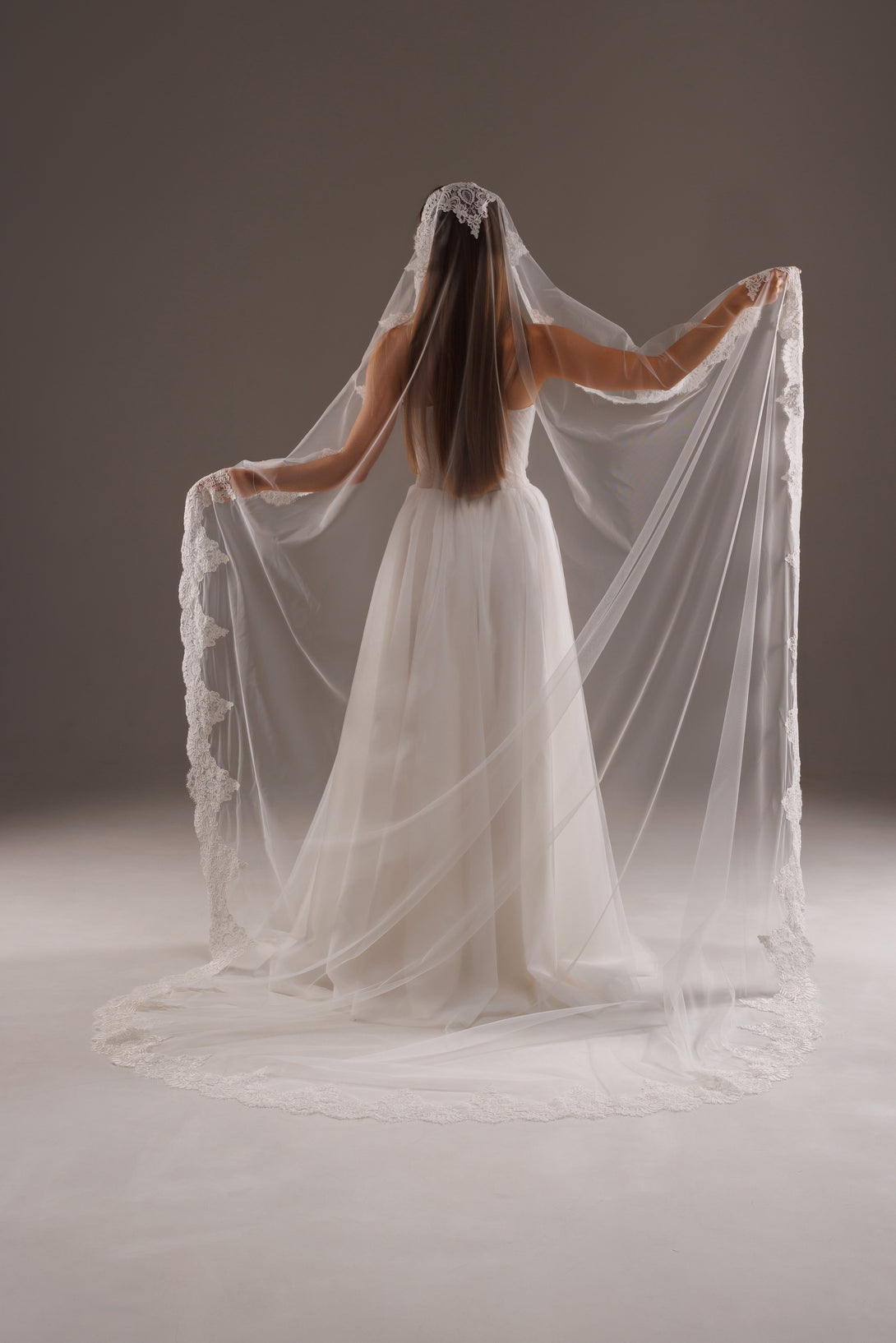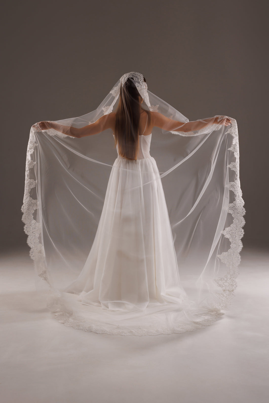 Elegant spanish mantilla lace trim veil ✔︎Details: soft tulle one layered rounded mantilla veil decorated with lace trim attachment with a metal comb available in different lengths Width - 79" Color...