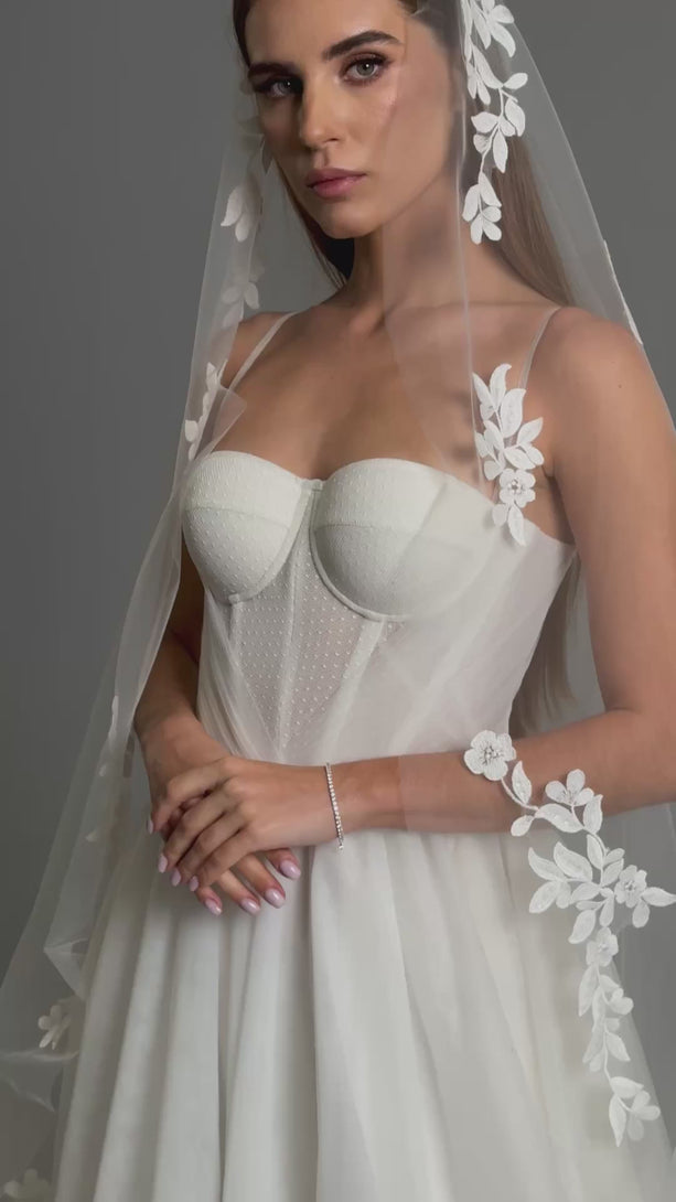 Rounded bridal mantilla veil with lace appliques ✔︎Details: soft tulle one layered rounded mantilla veil decorated with lace appliques Width - 200 cm (79" ) size on the photo 275 cm...