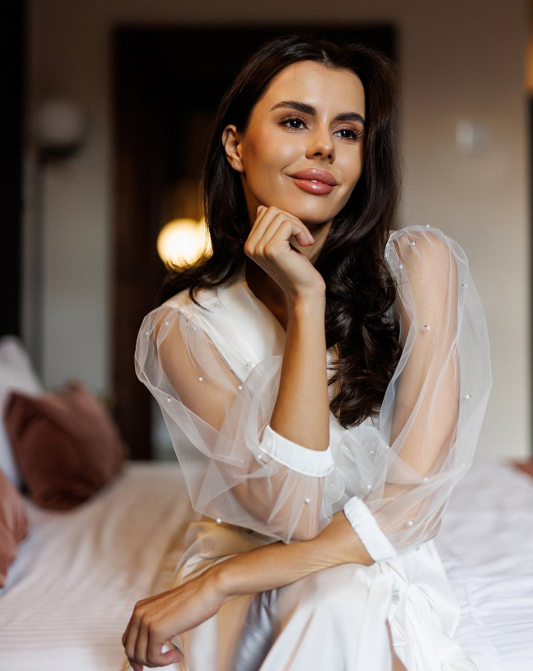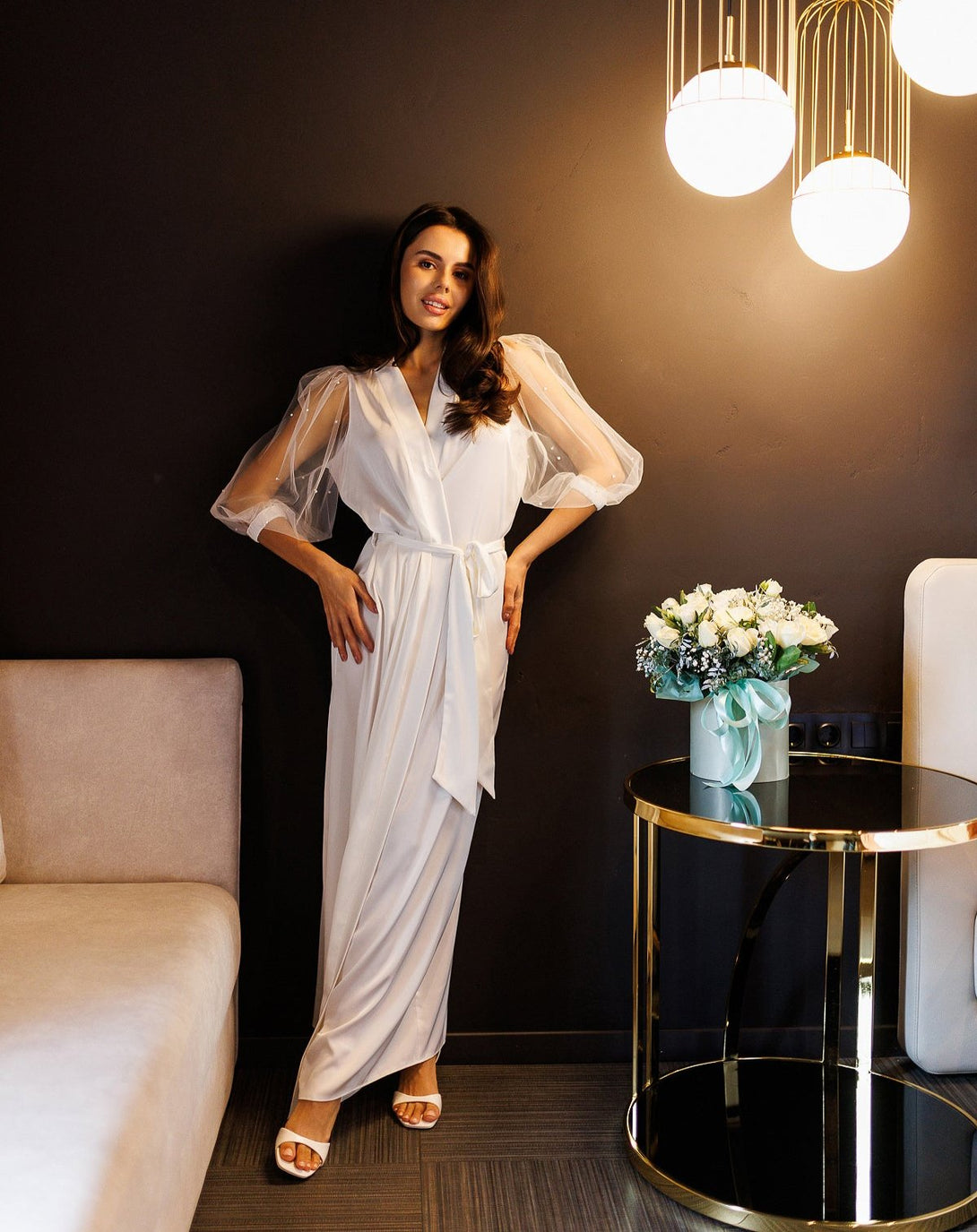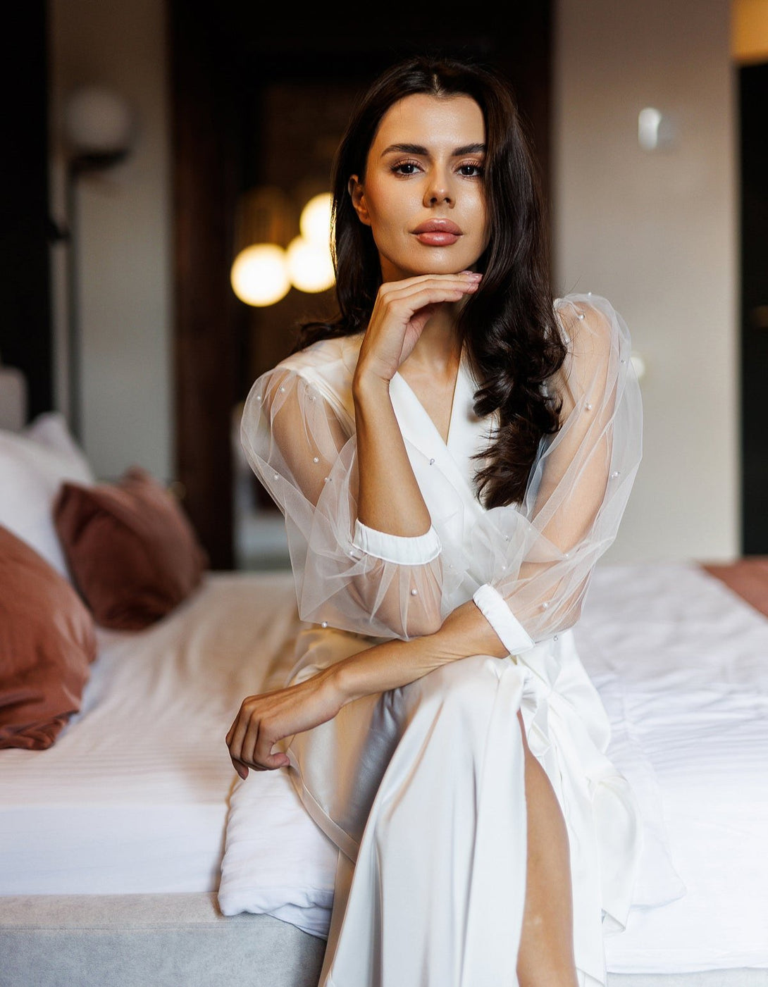 Luxurious and delicate bridal robe with tulle sleeves decorated with pearls. ✔︎Details: satin silk fabric tulle sleeves decorated with pearls attached with belt robe length is 140 cm (55 inches)