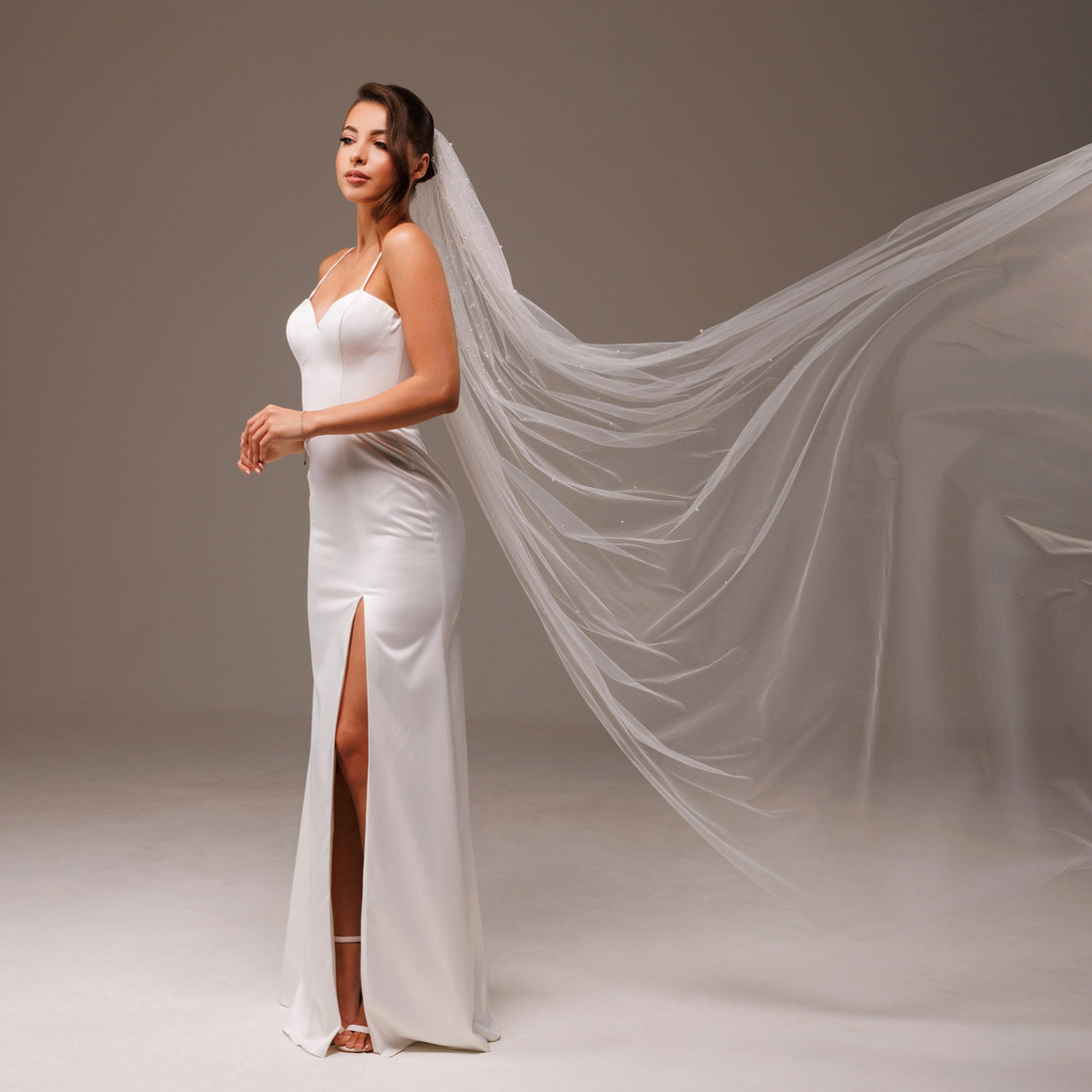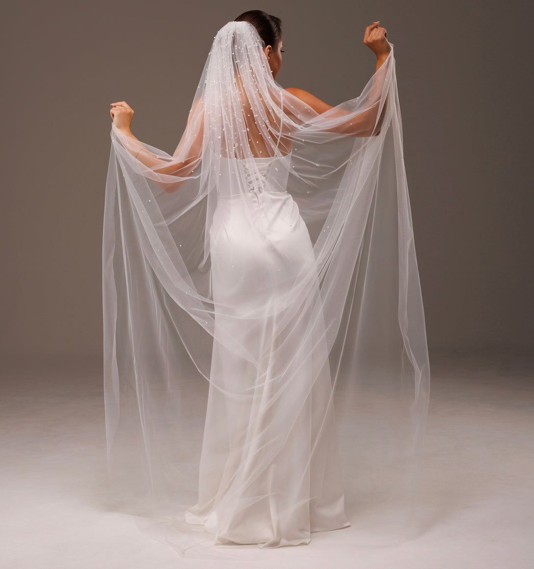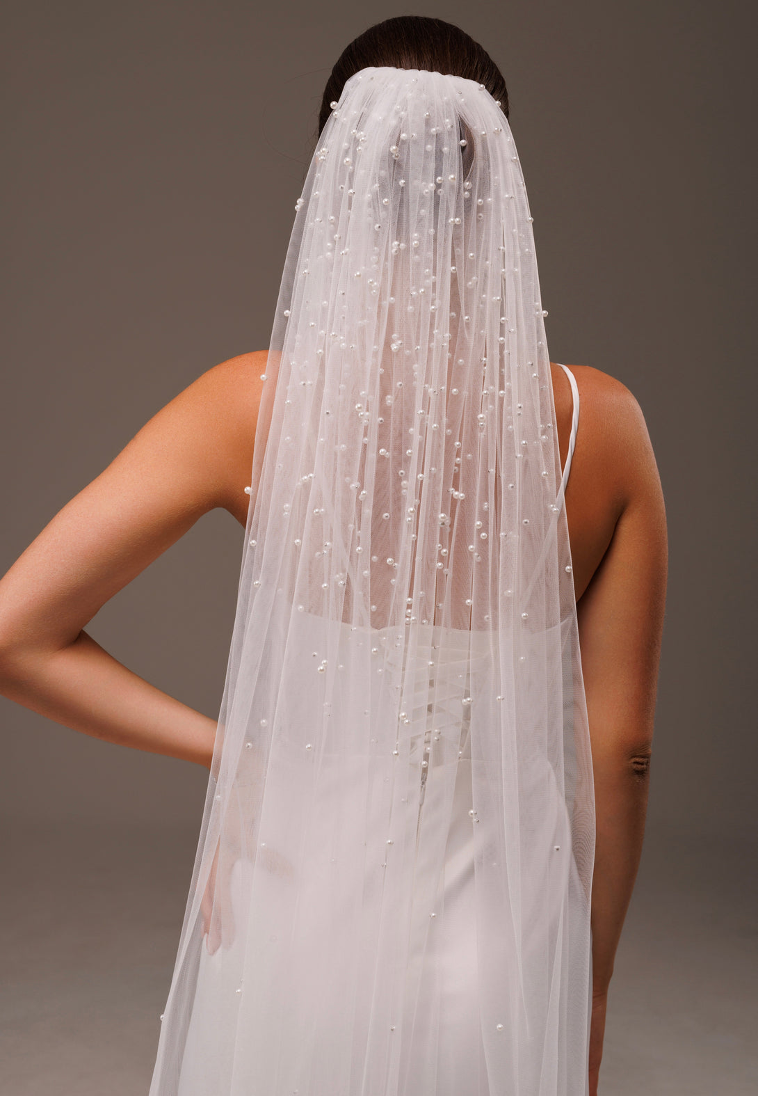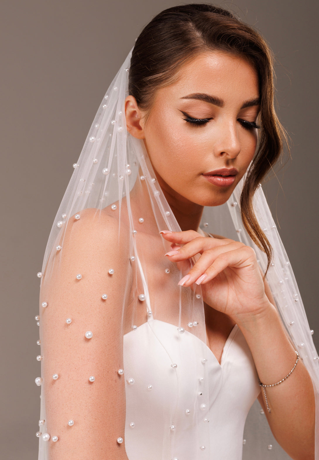 Pearls on the wedding veil - it's a beautiful point. Like many small shines on the soft bridal tulle. We use two sizes for better results and we know how to make the best pearl wedding veil for your Big Day.