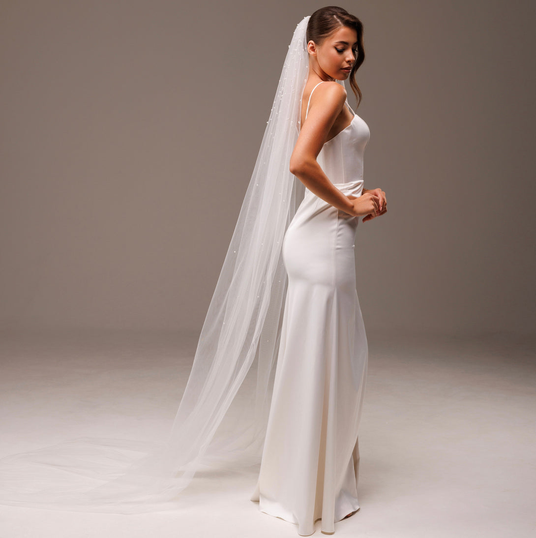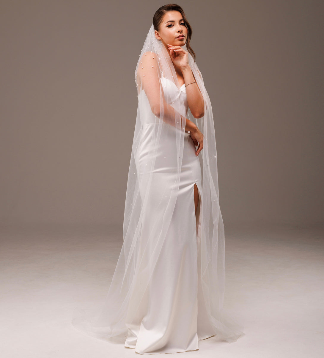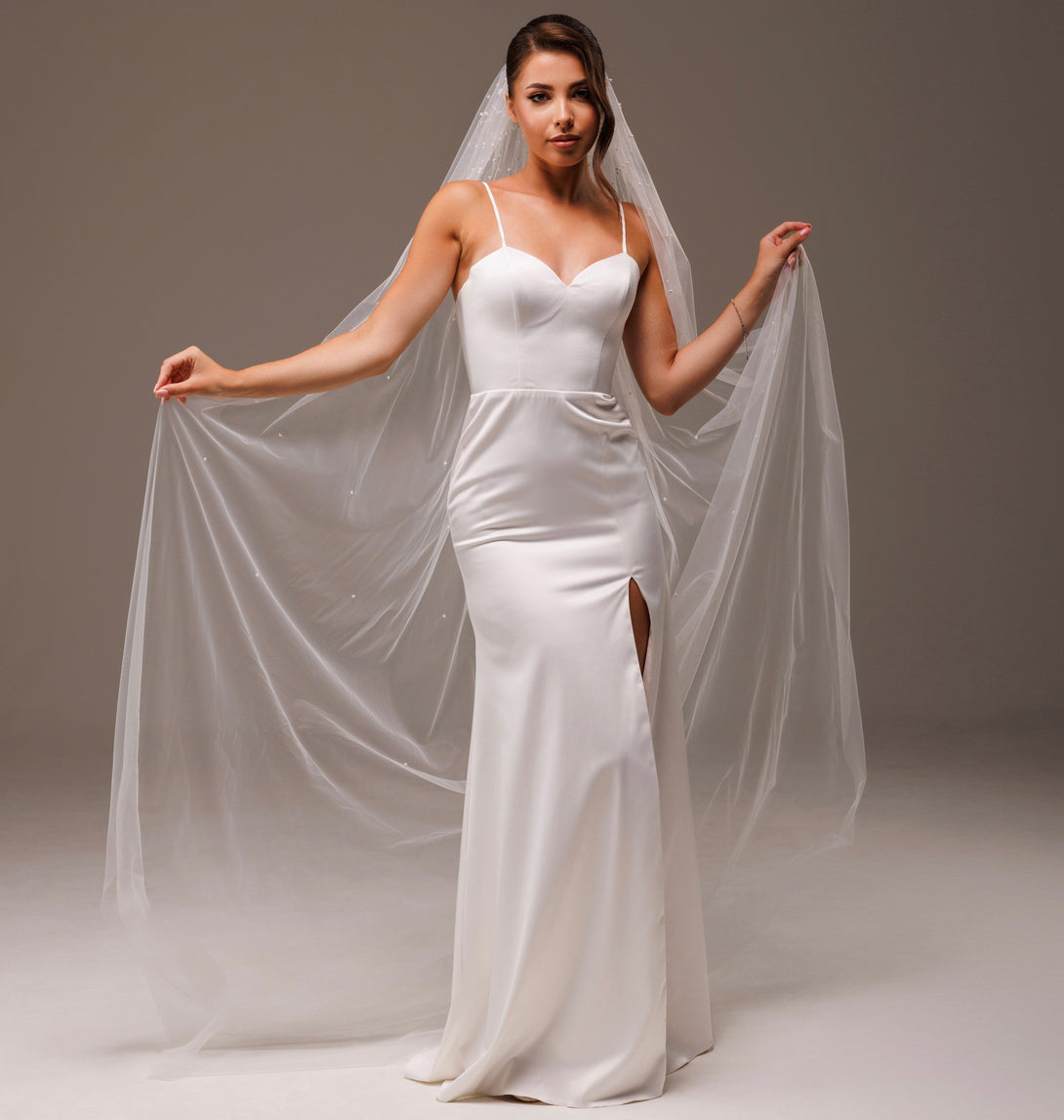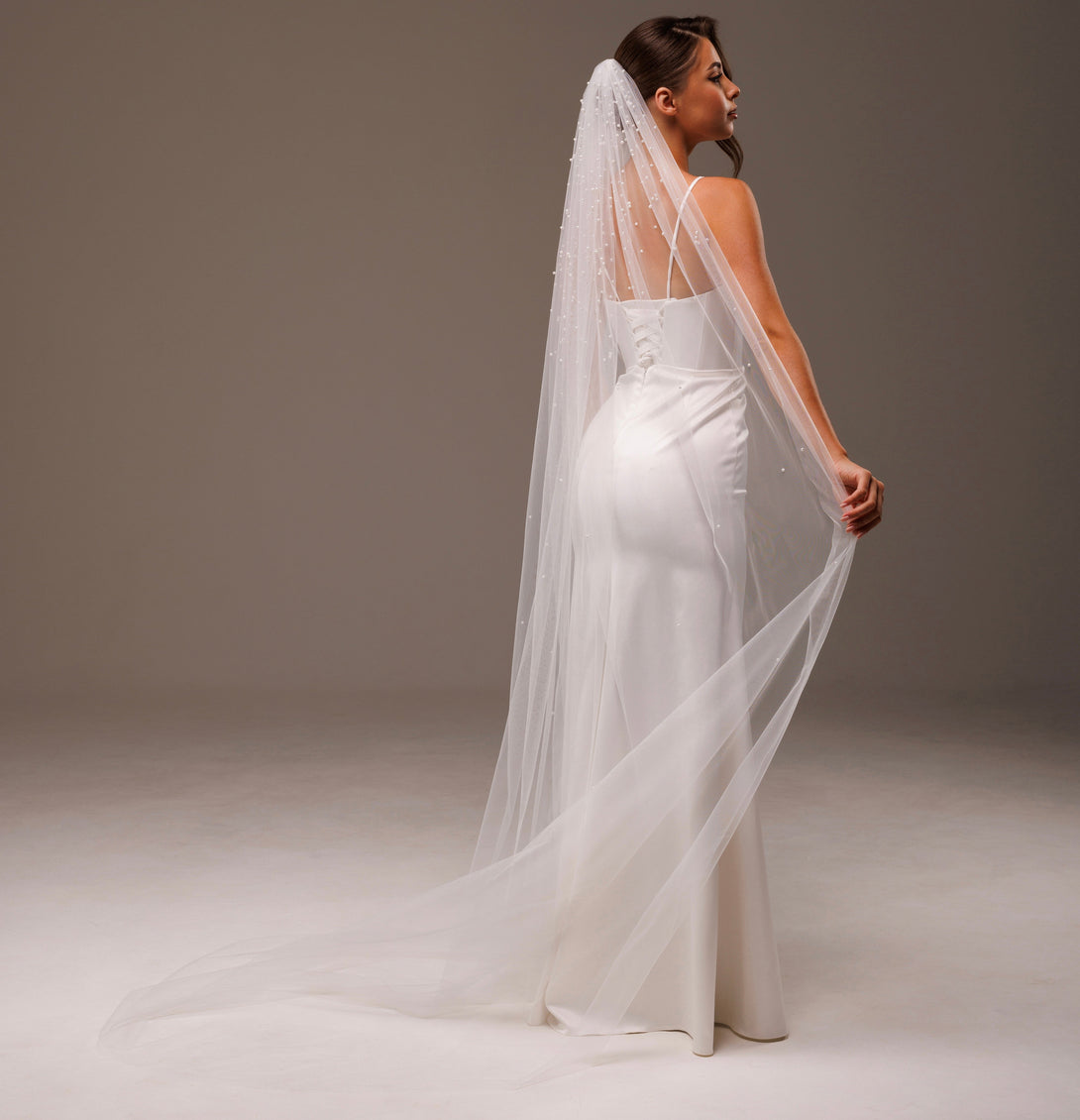 Pearls on the wedding veil - it's a beautiful point. Like many small shines on the soft bridal tulle. We use two sizes for better results and we know how to make the best pearl wedding veil for your Big Day.