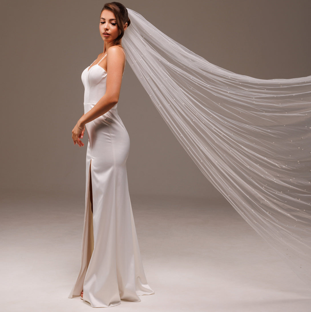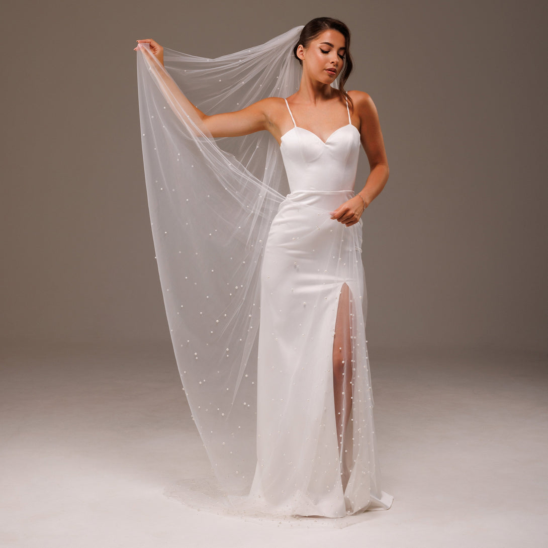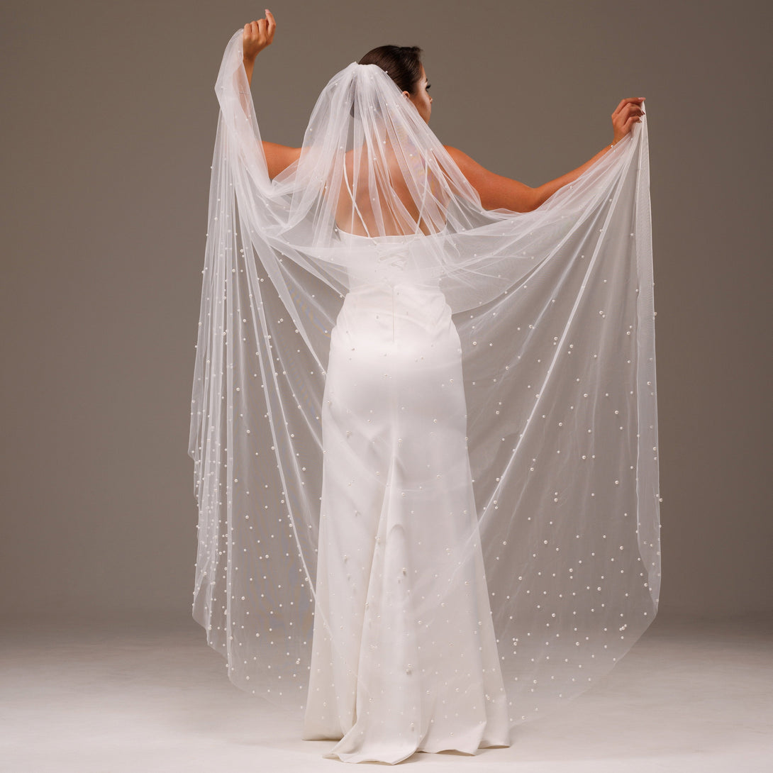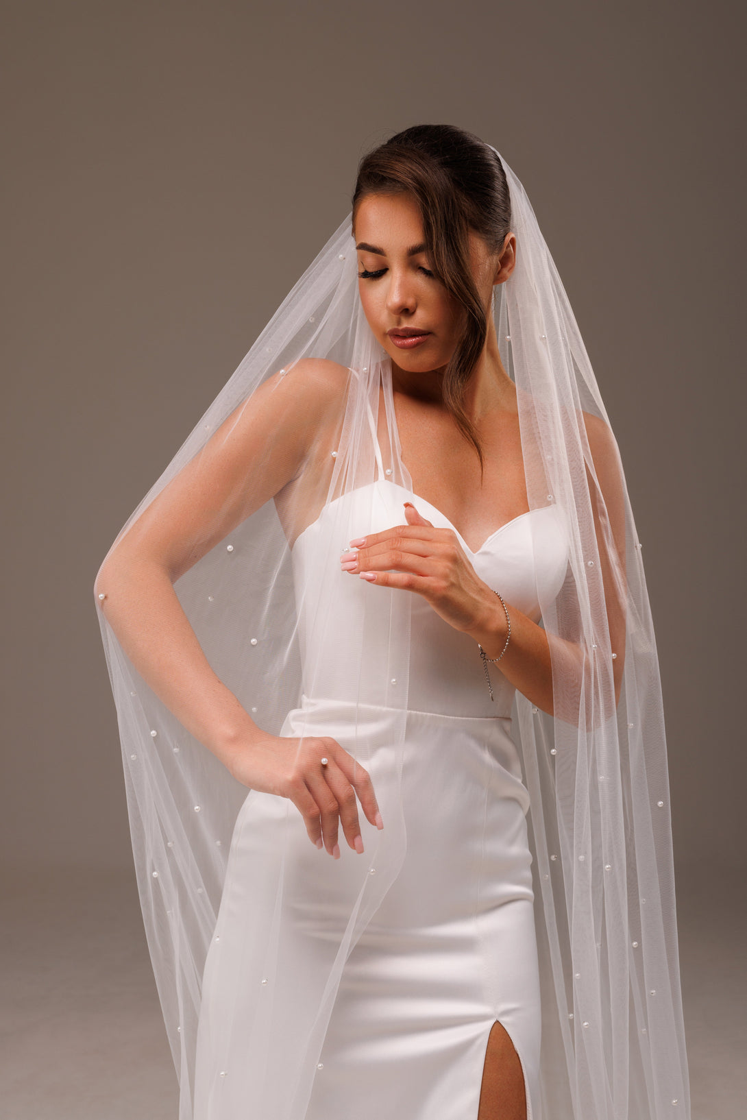 Wedding Veil With Cascading Pearls Cathedral Light ivory, V-2542