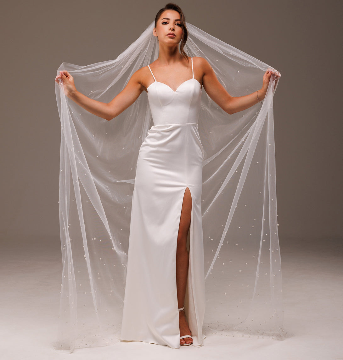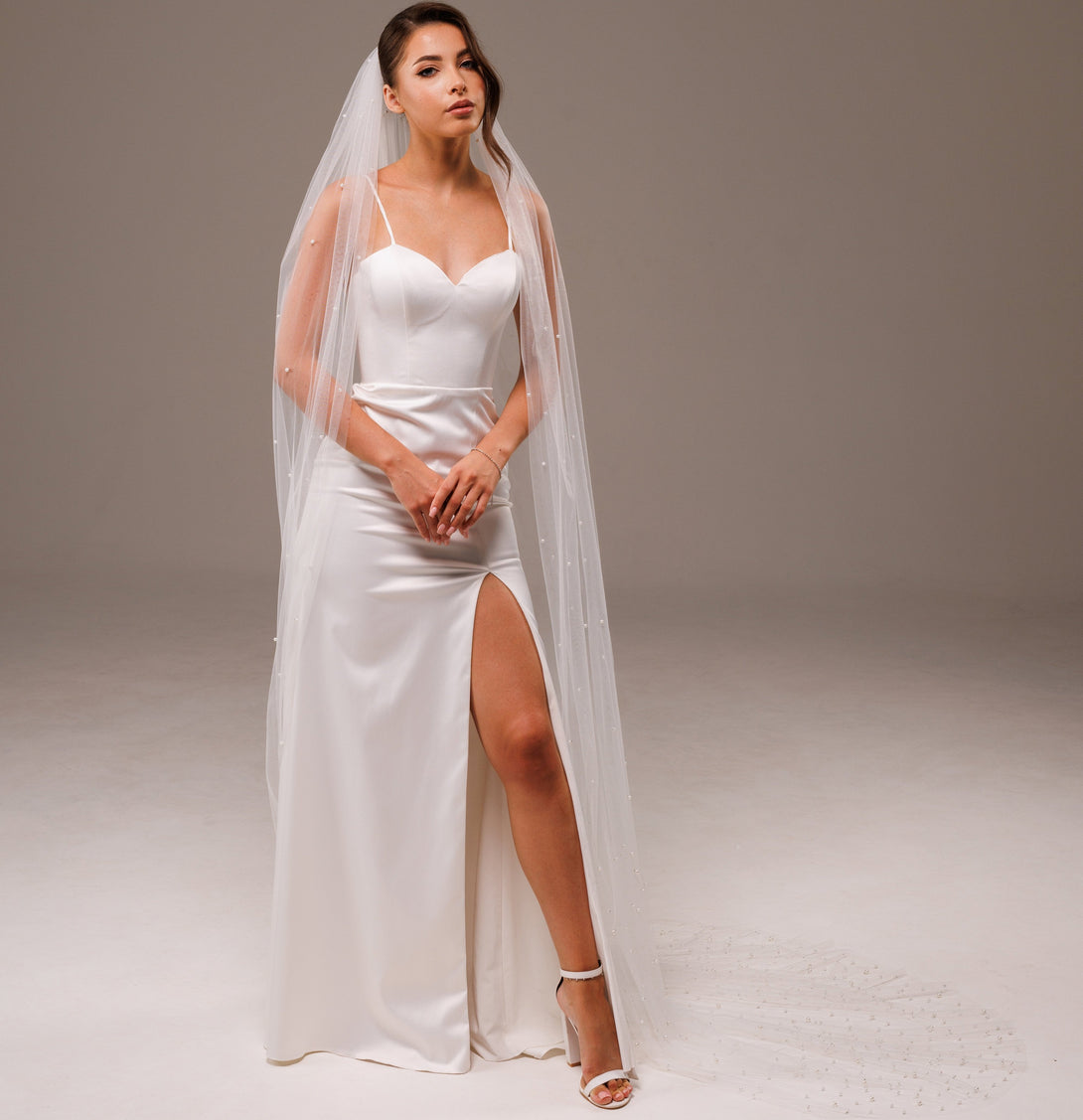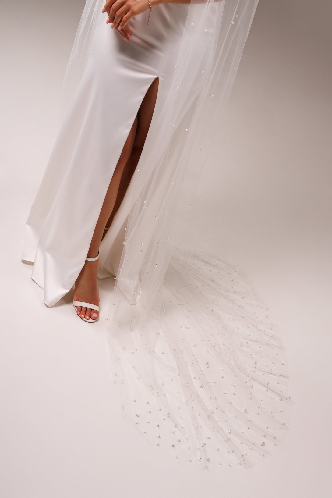 Wedding Veil With Cascading Pearls Cathedral Light ivory, V-2542