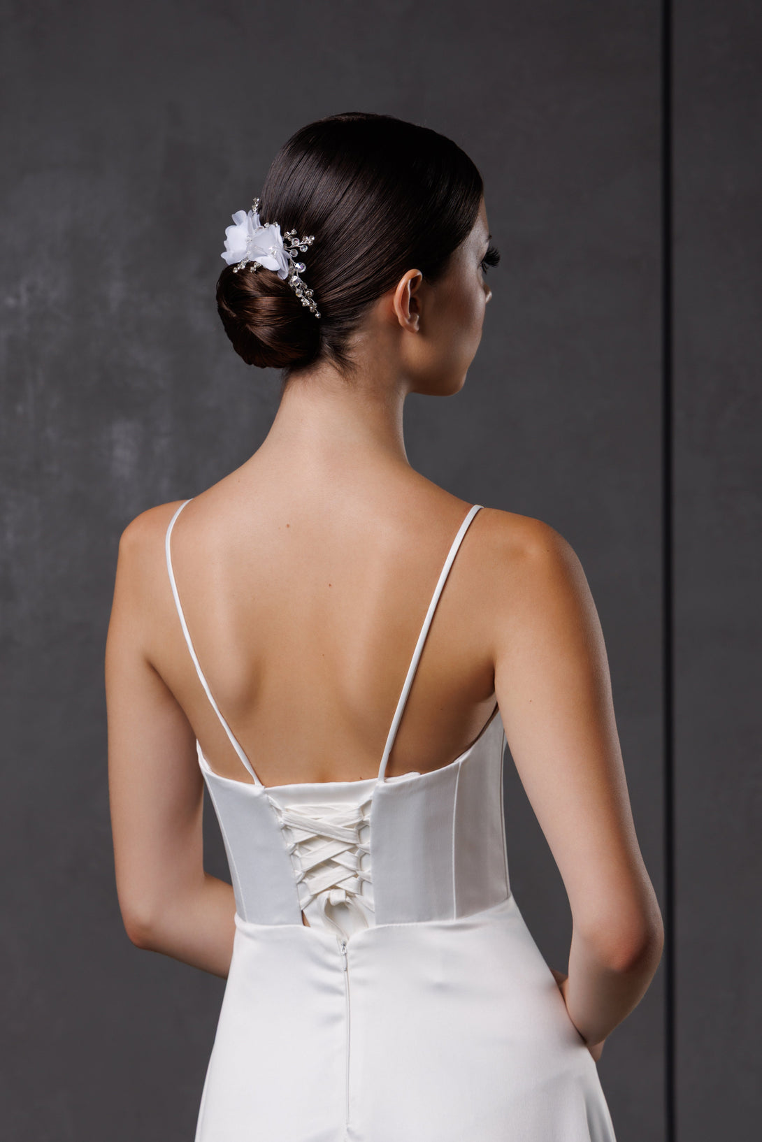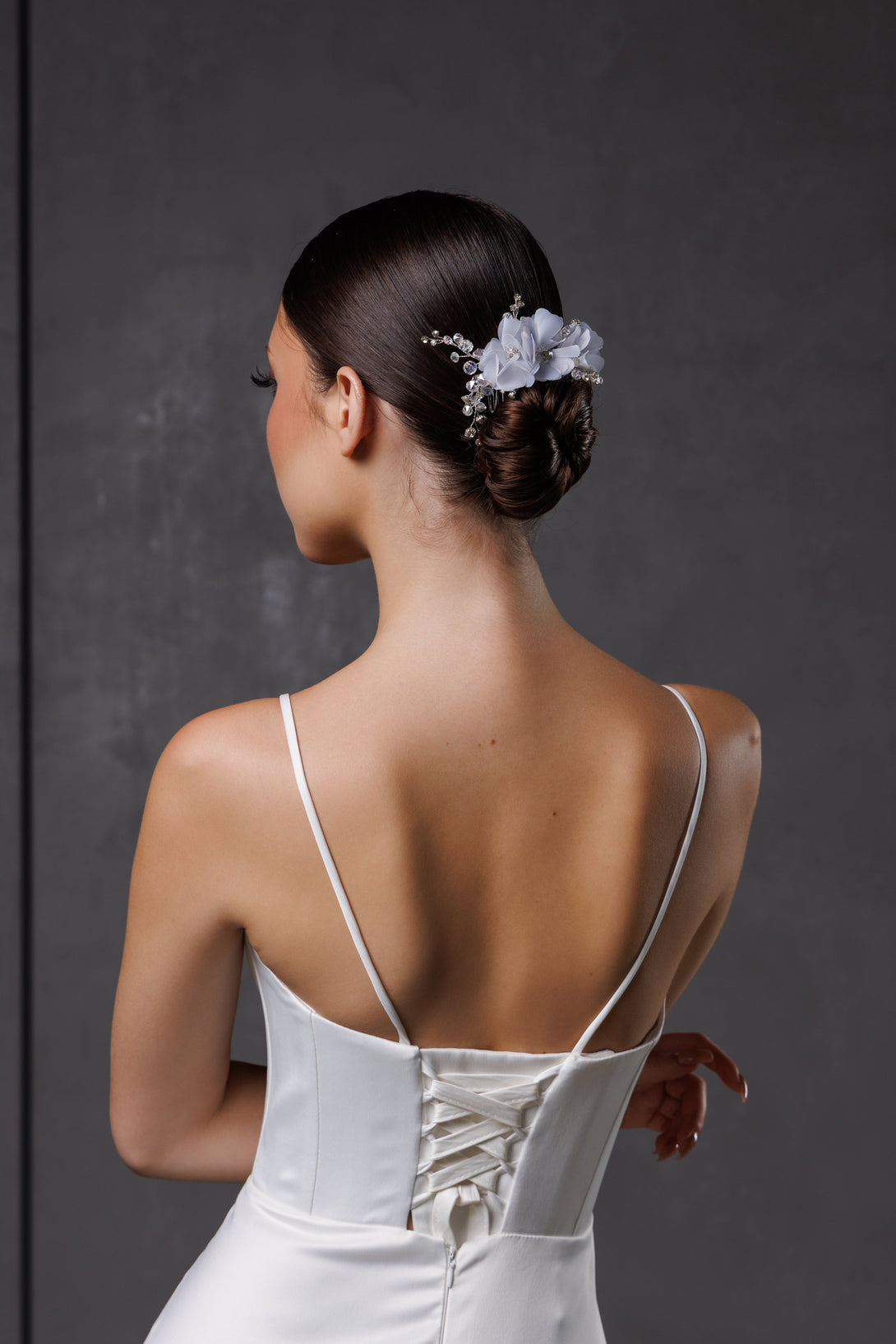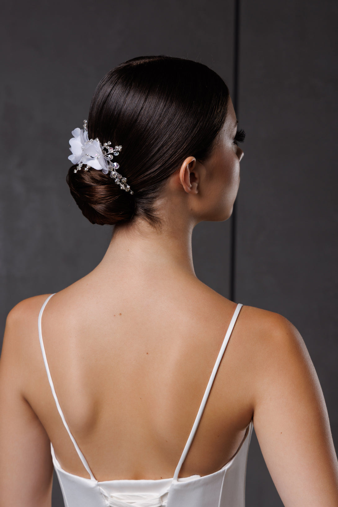Perfect for a bun or updo, it adds a touch of light, floral elegance to any bridal hairstyle.